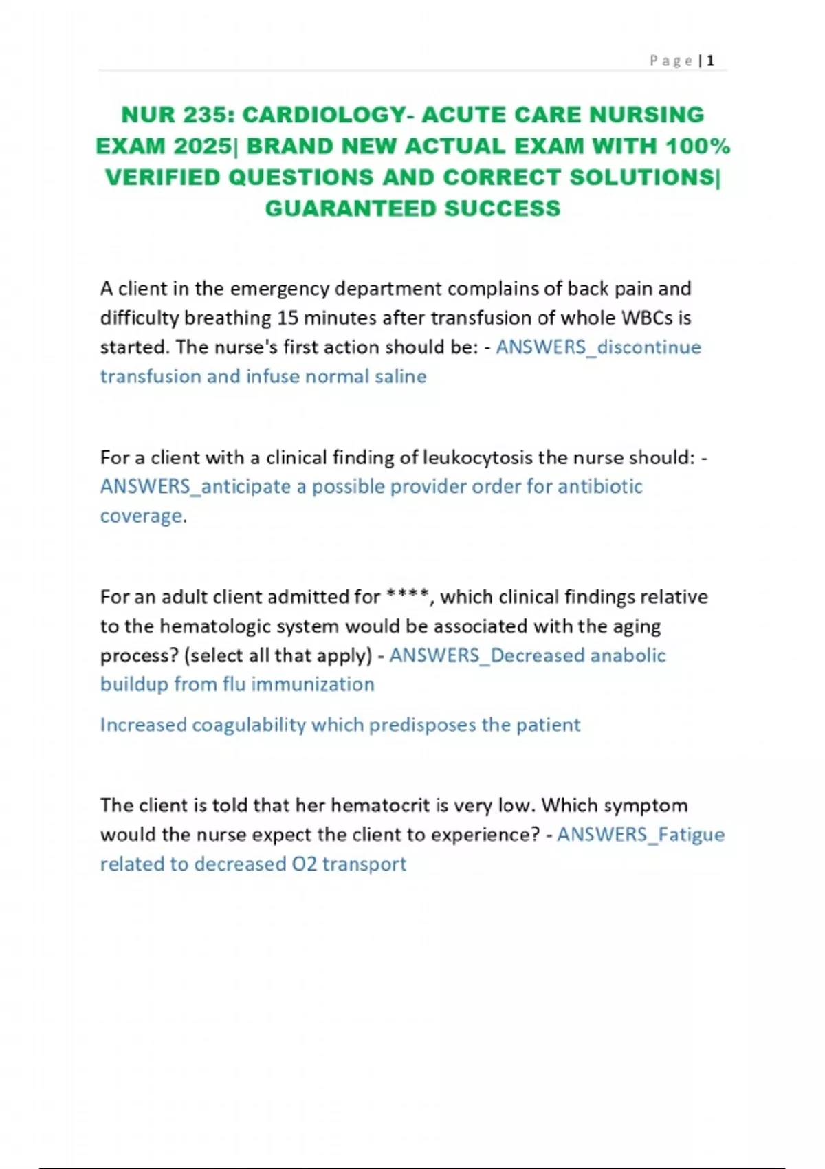 NUR 235: CARDIOLOGY- ACUTE CARE NURSING EXAM 2025| BRAND NEW ACTUAL EXAM WITH 100% VERIFIED QUESTIONS AND CORRECT SOLUTIONS| GUARANTEED SUCCESS 2 Exam (elaborations) NUR 235: Cardiology- Acute care nursing (Final Review) 2025/2026 Latest Update 3 Exam (elaborations) NUR 235: CARDIOLOGY- ACUTE CARE NURSING 2025| BRAND NEW ACTUAL EXAM WITH 100% VERIF