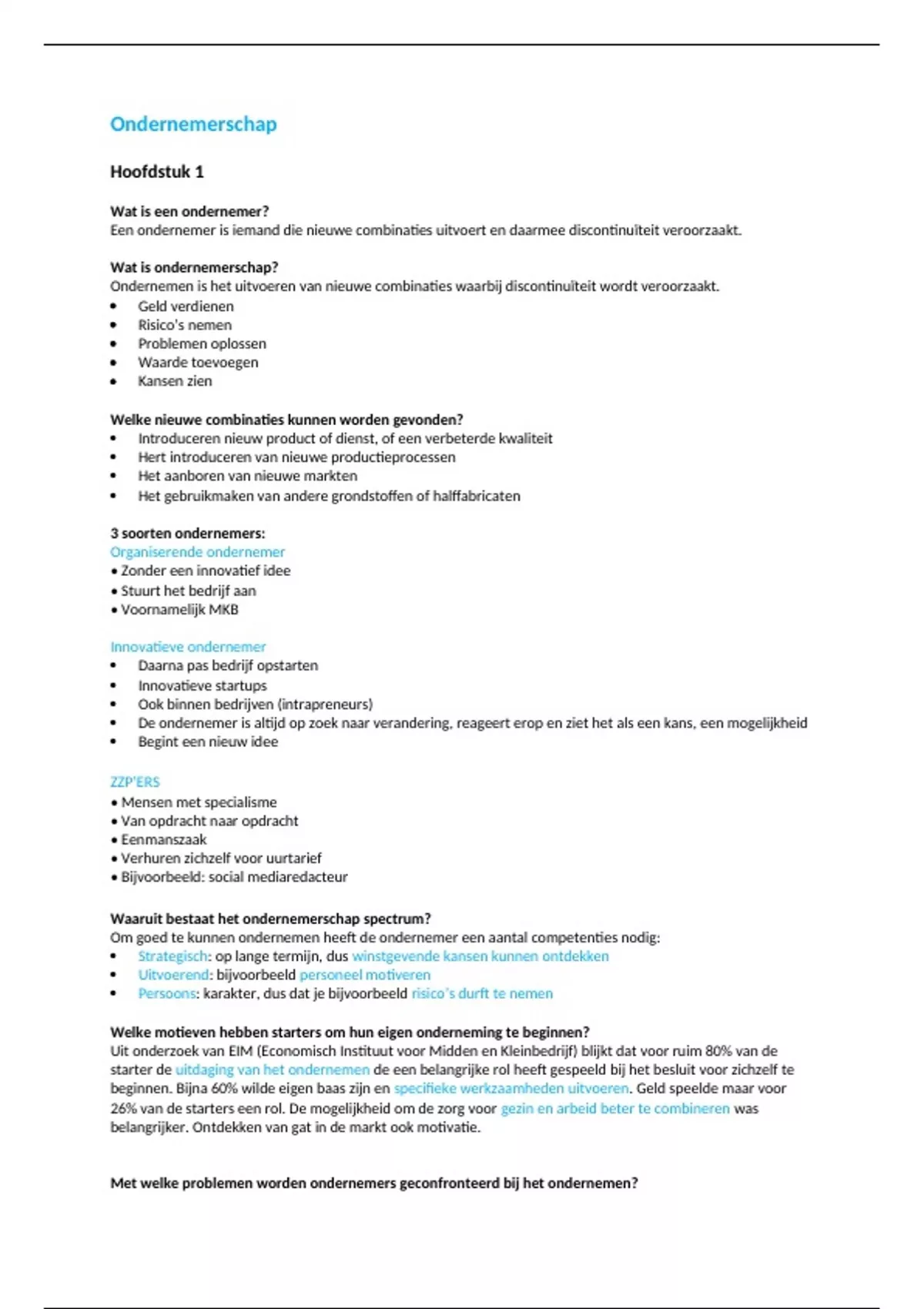 Ondernemerschap in hoofdlijnen samenvatting H1 t/m 10 + aantekeningen en formules