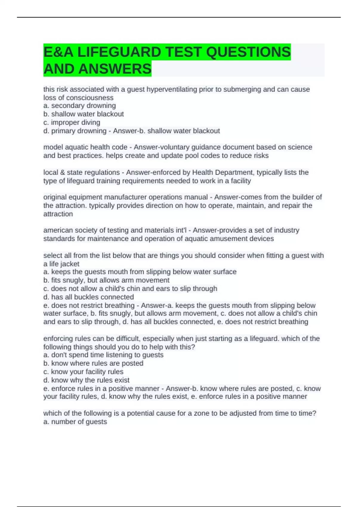 SAFETY MODULE #5: EXAM QUESTIONS AND ANSWERS 2 Exam (elaborations) SAFETY MODULE #5: EXAM QUESTIONS AND ANSWERS 3 Exam (elaborations) SUPPLEMENTAL OXYGEN EXAM QUESTIONS AND ANSWERS 4 Exam (elaborations) WATER RESCUES FOR RESPONSIVE GUESTS EXAM QUESTIONS AND ANSWERS 5 Exam (elaborations) LIFEGUARD NOTES EXAM QUESTIONS AND ANSWERS 6 Exam (elabor