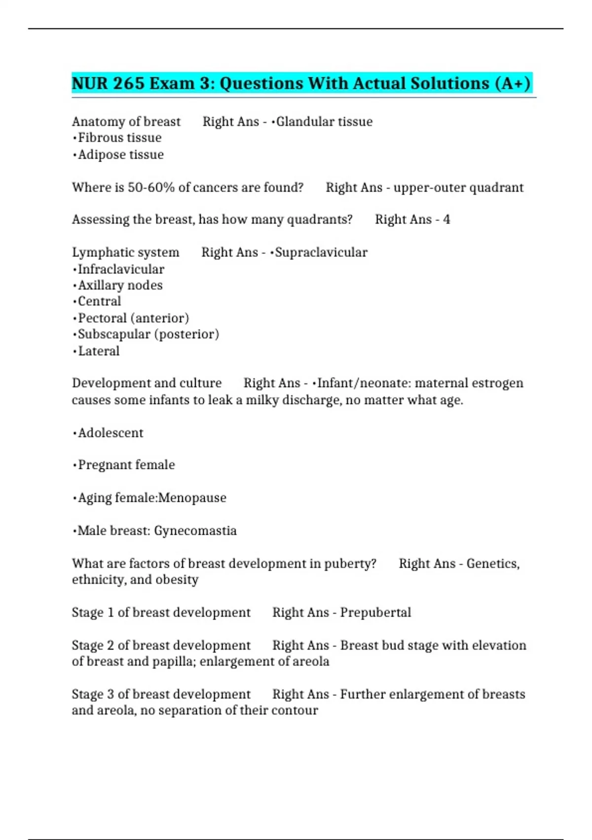 Nur 265 Exam - Questions With Relevant Solutions