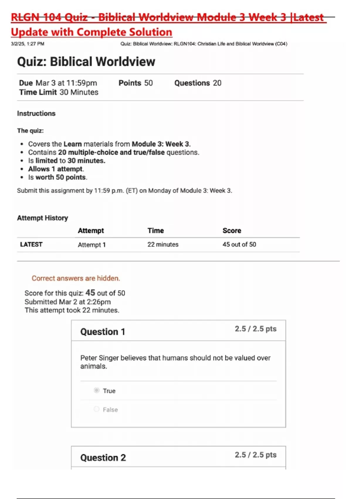 RLGN 104 Quiz - Christian Apologetics Module 1 Week 1 |Latest Update with Complete Solution RLGN 104 Quiz - Religious Worldviews Module 5 Week 5 |Latest Update with Complete Solution RLGN 104 Quiz - Salvation and the Gospel Message Module 4 Week 4 |Latest Update with Complete Solution RLGN 104 Quiz - Critical Thinking Module 2 Week 2 |Latest Update