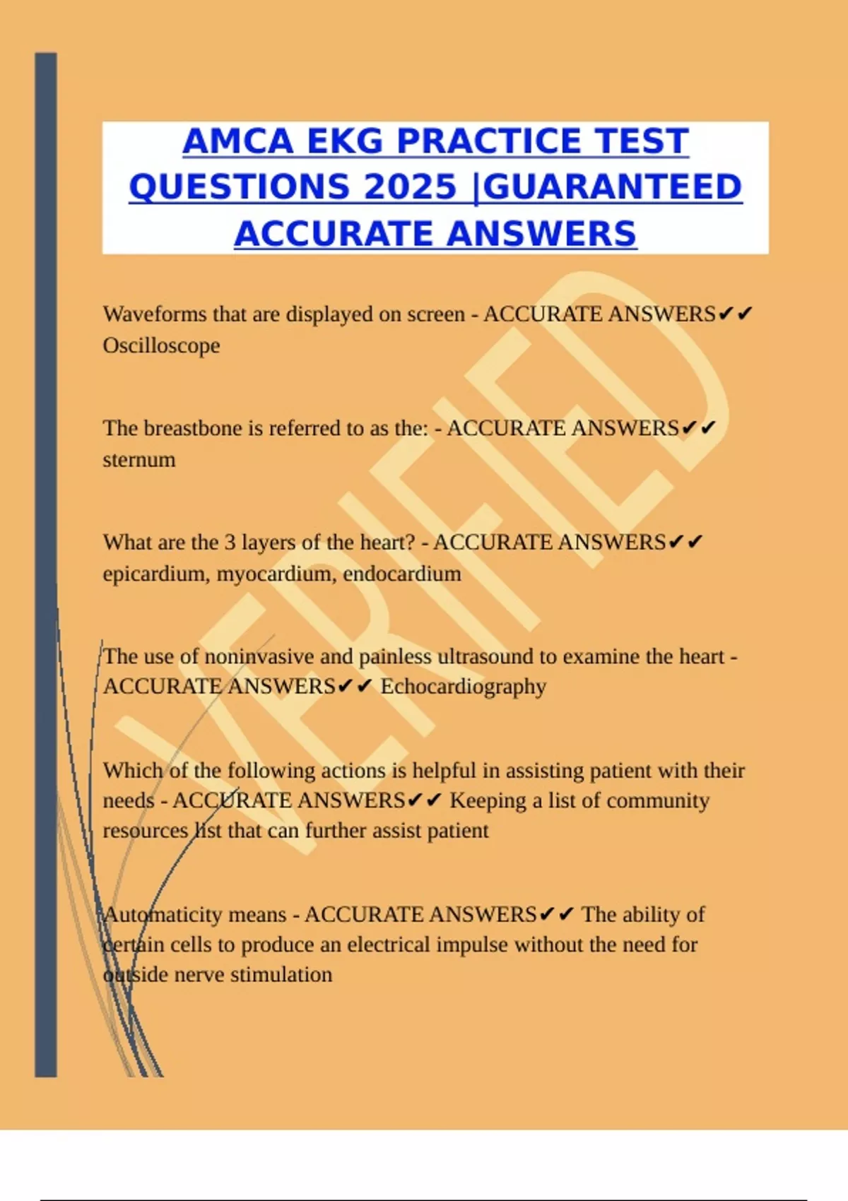 AMCA EKG PRACTICE TEST QUESTIONS 2025 |GUARANTEED ACCURATE ANSWERS AMCA EKG STUDY QUESTIONS 2025 |GUARANTEED ACCURATE ANSWERS AMCA EKG EXAM (SET 2025) |GUARANTEED ACCURATE ANSWER AMCA EKG/ECG PRE-TEST EXAM |GUARANTEED ACCURATE ANSWERS |COMPLETE EKG MED CERTS QUESTIONS 2025 |GUARANTEED ACCURATE ANSWERS