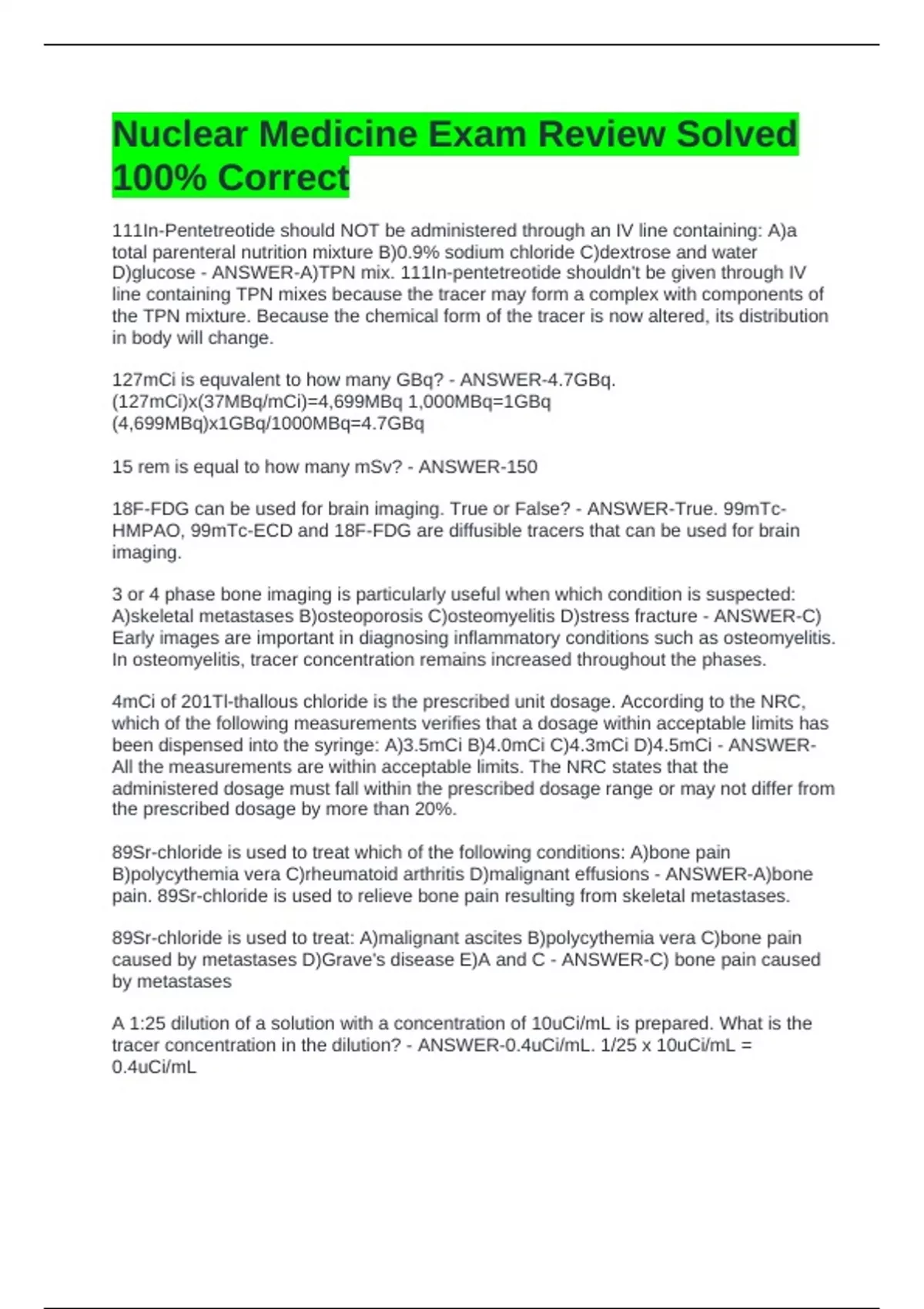 1 Exam (elaborations) Diagnostic Tests & Nuclear Medicine with Complete Solutions 2 Exam (elaborations) Intro to Nuclear Medicine Questions Solved 100% Correct 3 Exam (elaborations) Nuclear Medicine - Bone Exam 1 Solved 4 Exam (elaborations) Nuclear Medicine Board Review NMTCB Solved Rated A+ 5 Exam (elaborations) Nuclear Medicine Exam Review S