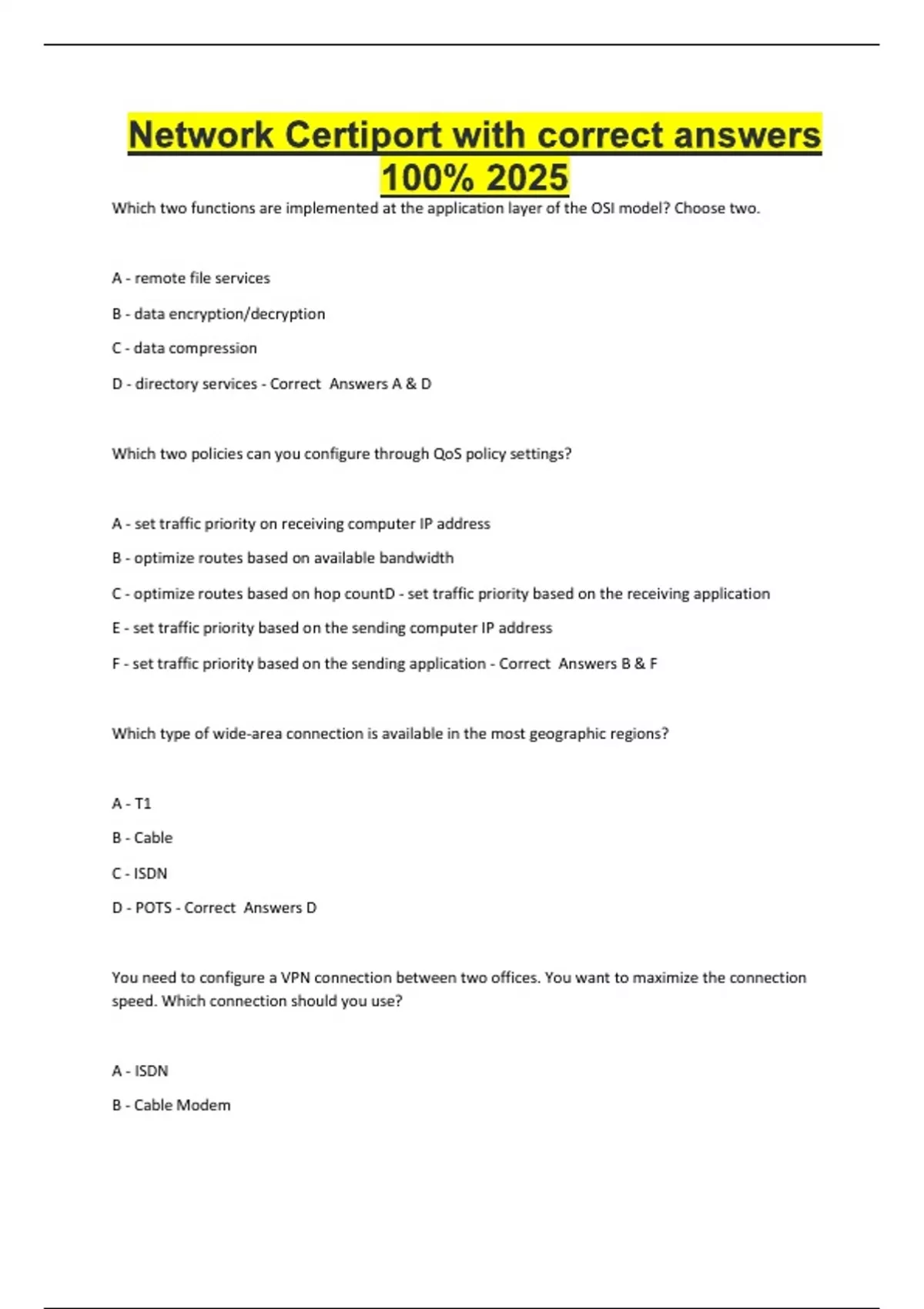 Network Certiport with correct answers 100% 2025 Which two functions are implemented at the application layer of the OSI model? Choose two. A - remote file services B - data encryption/decryption C - data compression D - directory services - Correct Answers A & D Which two policies can you configure through QoS policy settings? A - set traffic
