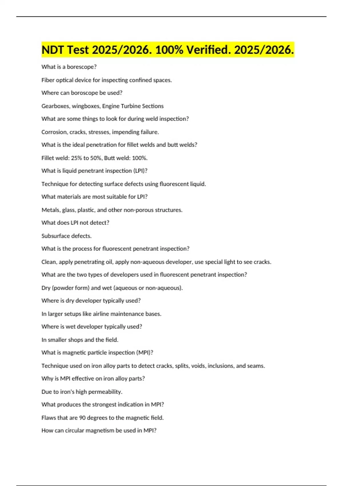 NDT UT Level 2 (Multiple Choice) 191 Questions and Correct Answers, 2025/2026. 100% Correct. NDT UT Level 2 (Answered) 2025/2026. 100% Verified. 104Q&A. NDT TESTING (Answered) 98 Questions and Correct Answers, 100% Verified. 2025/2026. NDT Test 2025/2026. 100% Verified. 2025/2026.