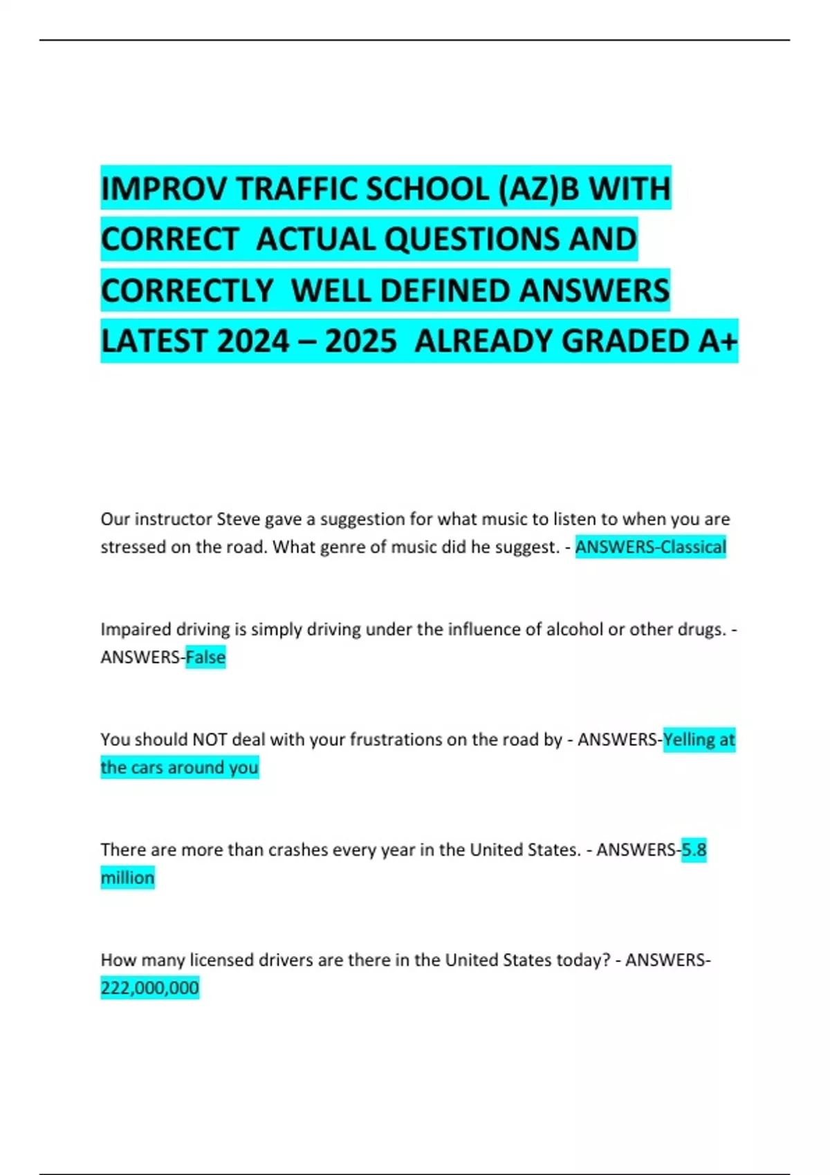 BUNDLE FOR IMPROV TRAFFIC SCHOOL EXAMS BUNDLE FOR IMPROV TRAFFIC SCHOOL EXAMS