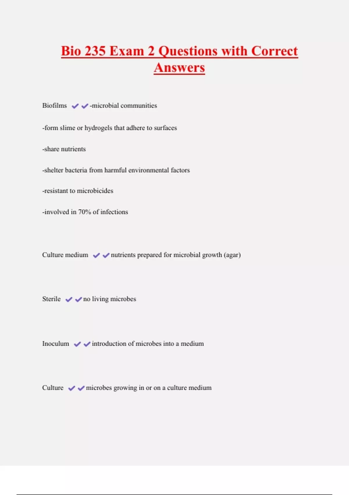 Bio 235 Exam 2 Questions with Correct Answers 2 Exam (elaborations) bio 235 exam 3 study guide Questions and Answers Verified by Experts 3 Exam (elaborations) BIO 235 Final Exam Questions and Answers 100% Solved 4 Exam (elaborations) BIO 235 - Final Exam Study Guide Questions and Answers Verified by Experts 5 Exam (elaborations) BIO 235 (Kovacs