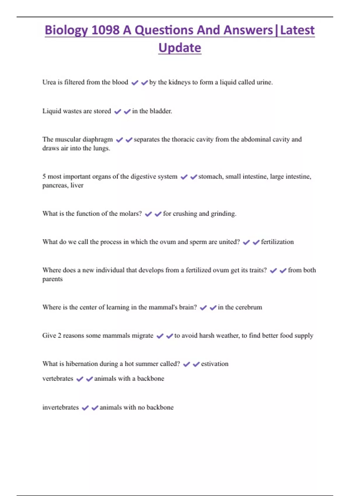 Biology 1098 A Questions And Answers|Latest Update 2 Exam (elaborations) Biology 1098 Self Test Questions And Answers|Latest Update 3 Exam (elaborations) Biology 1098 Test (New Edition) Questions And Answers|Latest Update