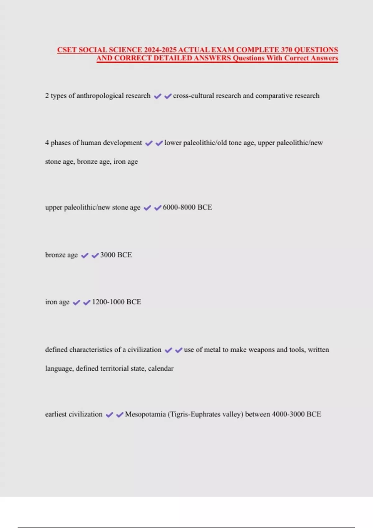 CSET SOCIAL SCIENCE ACTUAL EXAM COMPLETE 370 QUESTIONS 2 Exam (elaborations) CSET Social Science subtest 1 Questions and Answers 100% Solved