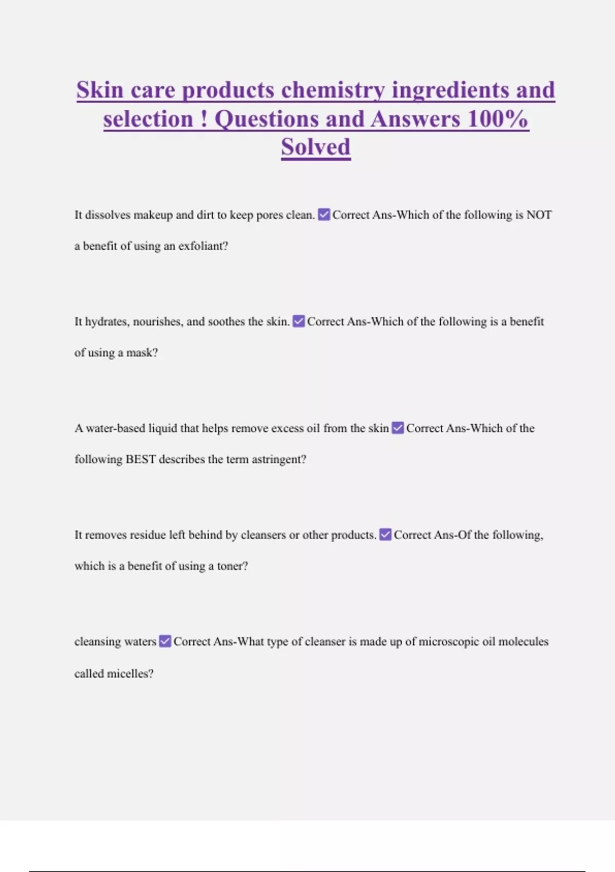 Skin care products: chemistry, ingredients, and selection Questions with Complete Solutions 2 Exam (elaborations) Skin Care Products: Chemistry, Ingredients and Selection Questions and Answers 100% Solved 3 Exam (elaborations) Skin Care Products: Chemistry, Ingredients, and Selection Questions with Correct Answers 4 Exam (elaborations) Skin Care