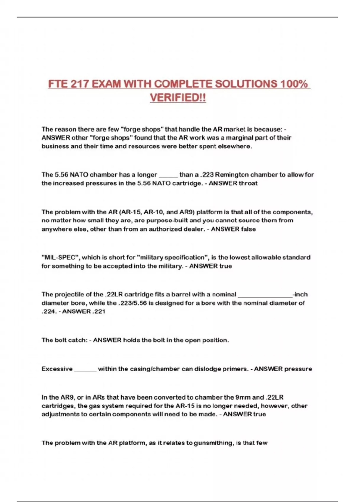 FTE AR-15 ADVANCED ARMORER EXAM QUESTIONS AND CORRECT ANSWERS!!