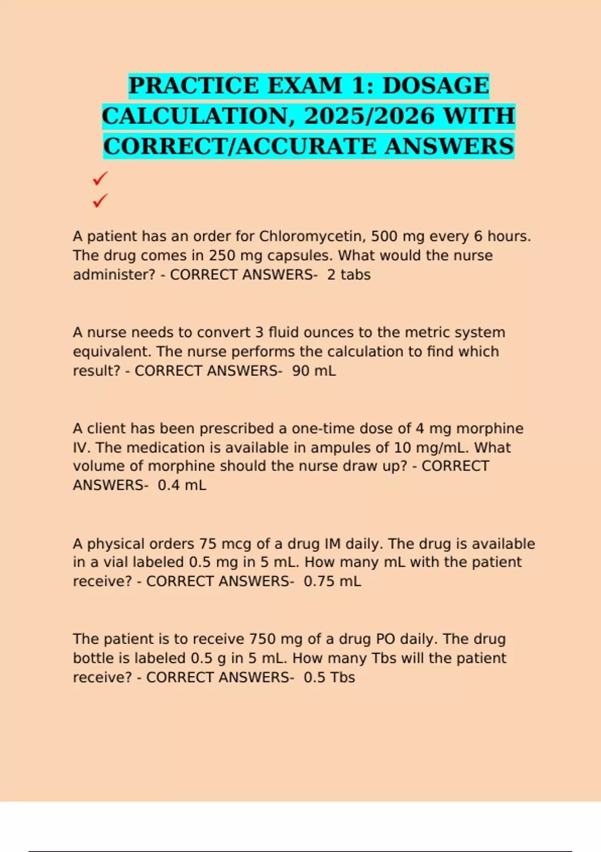 BSN 215 PHARMACOLOGY: QUIZ EXAM, 2025/2026 WITH CORRECT/ACCURATE ANSWERS METHODS OF CALCULATING DOSAGES BSN 215 SHERPATH: EXAM, 2025/2026 WITH CORRECT/ACCURATE ANSWERS WEEK 3 SHERPATH EXAM: BSN HESI 215 PHARMACOLOGY, 20025/2026 WITH CORRECT/ACCURATE ANSWERS CALCULATIONS HESI DOSAGE: EXAM, 2025/2026 WITH CORRECT/ACCURATE ANSWERS CALCULATIONS PRACTIC