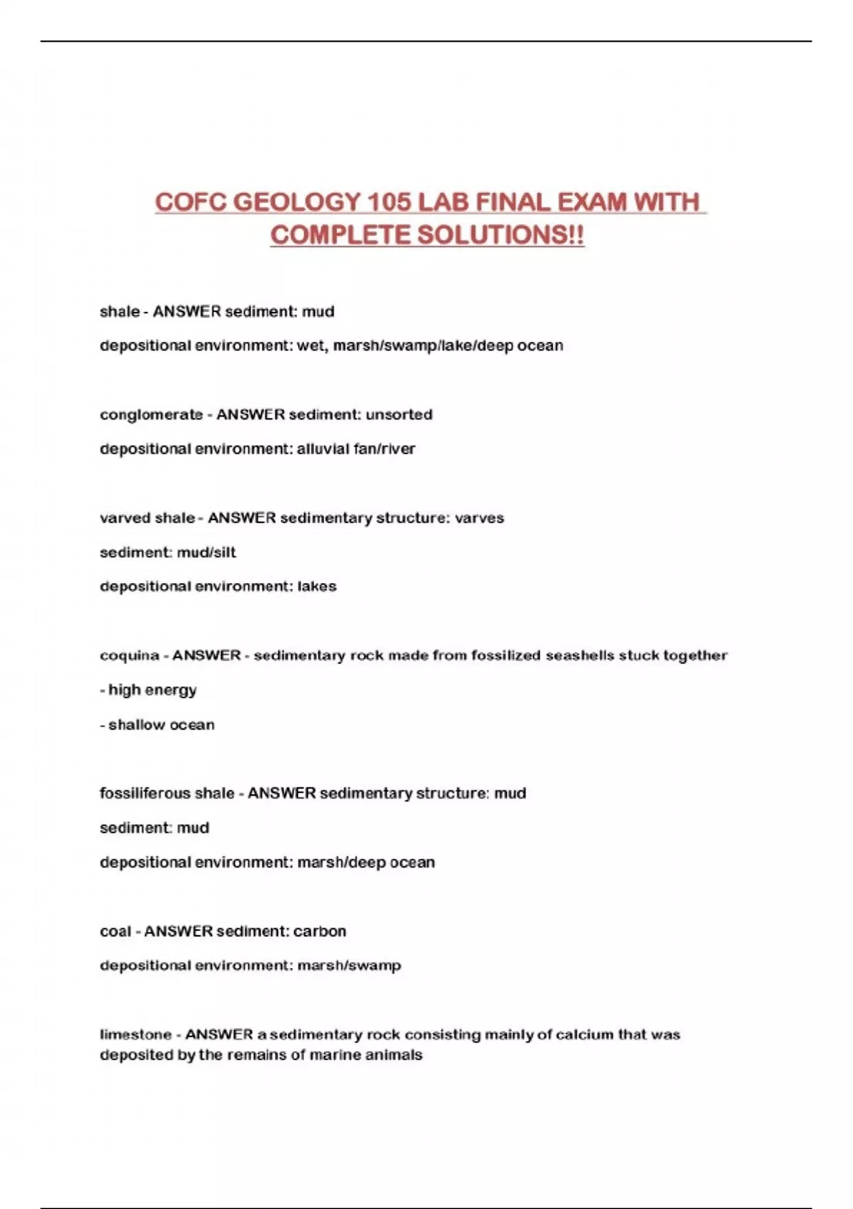 COFC GEOLOGY 105 LAB FINAL EXAM WITH COMPLETE SOLUTIONS!!