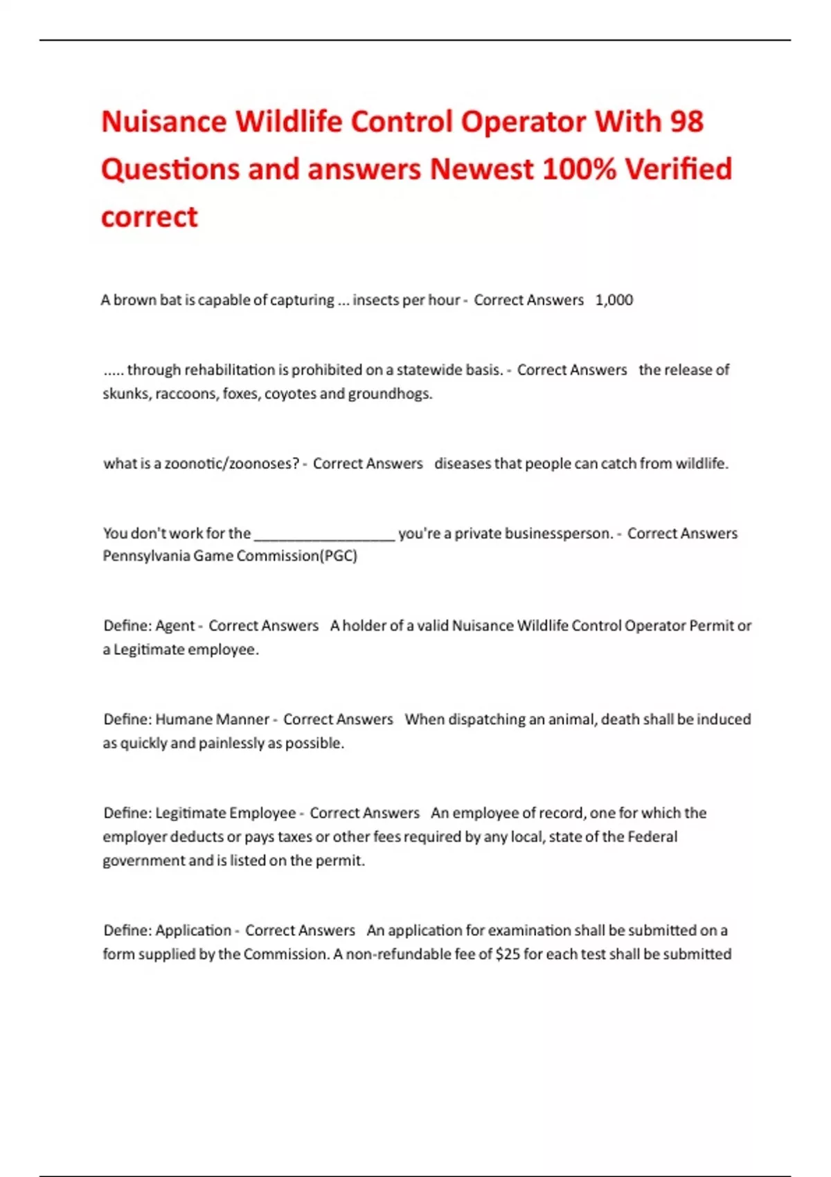 Exam (elaborations) Nuisance Wildlife Control Operator With 98 Questions and answers Newest 100% Verified correct 2 Exam (elaborations) PA Nuisance Wildlife Control Operator With 149 Questions and answers 100% pass Guaranteed success 2025/2026 3 Exam (elaborations) GA Nuisance Wildlife Control Test With complete solution Newest Rated A+ 2025/2026