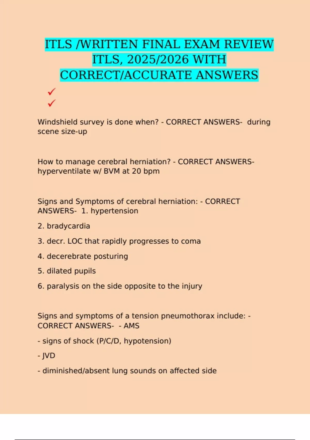 INTERNATIONAL TRAUMA LIFE SUPPORT (ITLS): EXAM, 2025/2026 WITH CORRECT/ACCURATE ANSWERS ADVANCED ITLS PRE-TEST: EXAM, 2025/2026 WITH CORRECT/ACCURATE ANSWERS REVIEW EXAM QUESTIONS: INTERNATIONAL TRAUMA LIFE SUPPORT/ITLS, 2025/2026 WITH CORRECT/ACCURATE ANSWERS EXAM ITLS: INTERNATIONAL TRAUMA LIFE SUPPORT, 2025/2026 WITH CORRECT/ACCURATE ANSWERS ITL