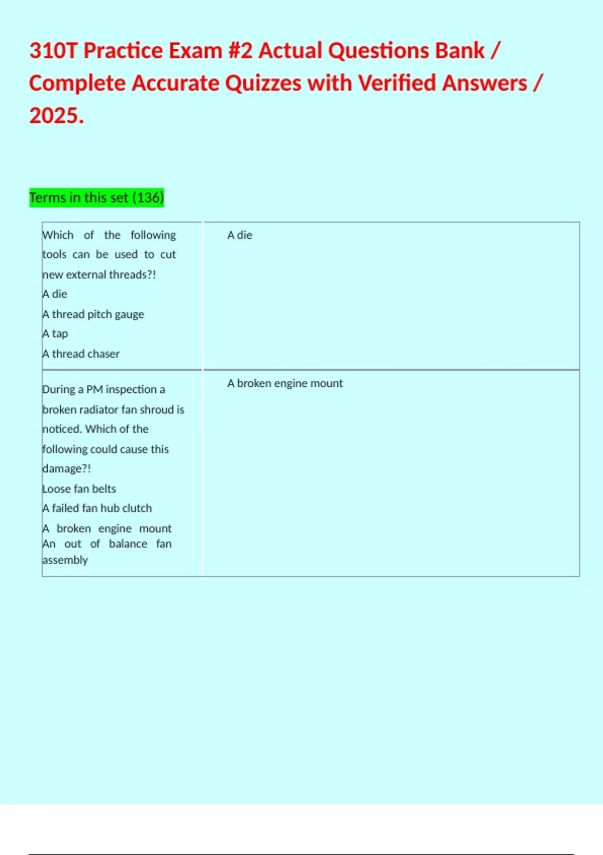 1 Exam (elaborations) 310T Practice Exam #2 Actual Questions Bank / Complete Accurate Quizzes with Verified Answers / 2025. 2 Exam (elaborations) C of Q 310T Prep / Actual Questions Bank / Complete Accurate Quizzes with Verified Answers / 2025.