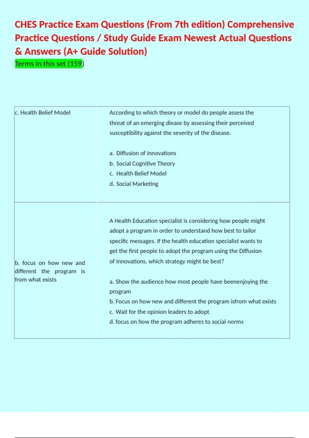 1 Exam (elaborations) CHES Practice Exam Questions (From 7th edition) Comprehensive Practice Questions / Study Guide Exam Newest Actual Questions & Answers (A+ Guide Solution) 2 Exam (elaborations) CHES EXAM STUDY GUIDE / EXPERT VERIFIED ACTUAL QUESTIONS & ANSWERS FOR GUARANTEED PASS | NEWEST UPDATE, . 3 Exam (elaborations) CHES- Practic