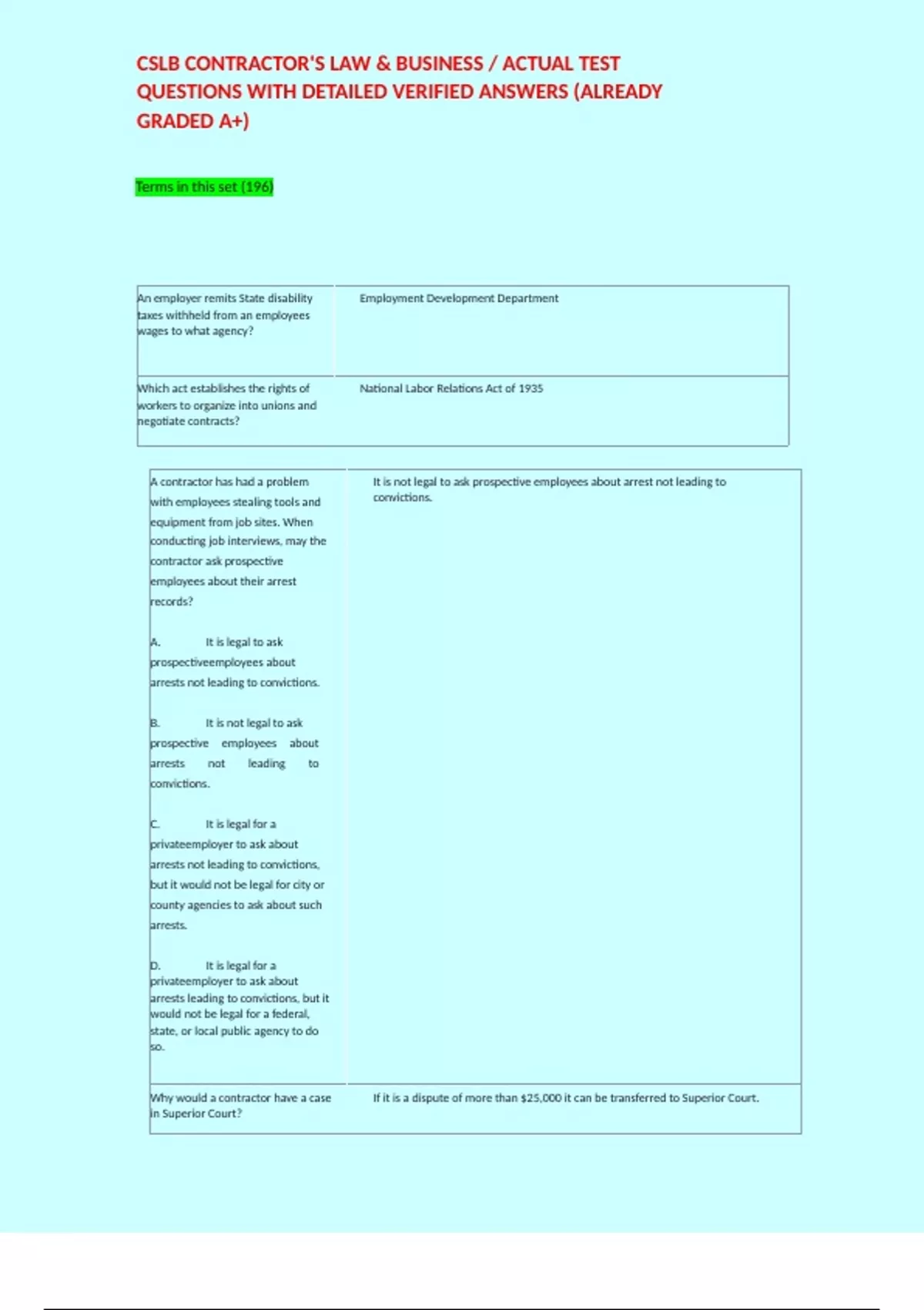 1 Exam (elaborations) CSLB B LICENSE GENERAL CONTRACTOR EXAM / STUDY GUIDE ACTUAL QUESTIONS AND ANSWERS (A+ GUIDE SOLUTION) NEWEST 2025/2026 2 Exam (elaborations) CSLB CONTRACTOR S LAW & BUSINESS / ACTUAL TEST QUESTIONS WITH DETAILED VERIFIED ANSWERS (ALREADY GRADED A+)