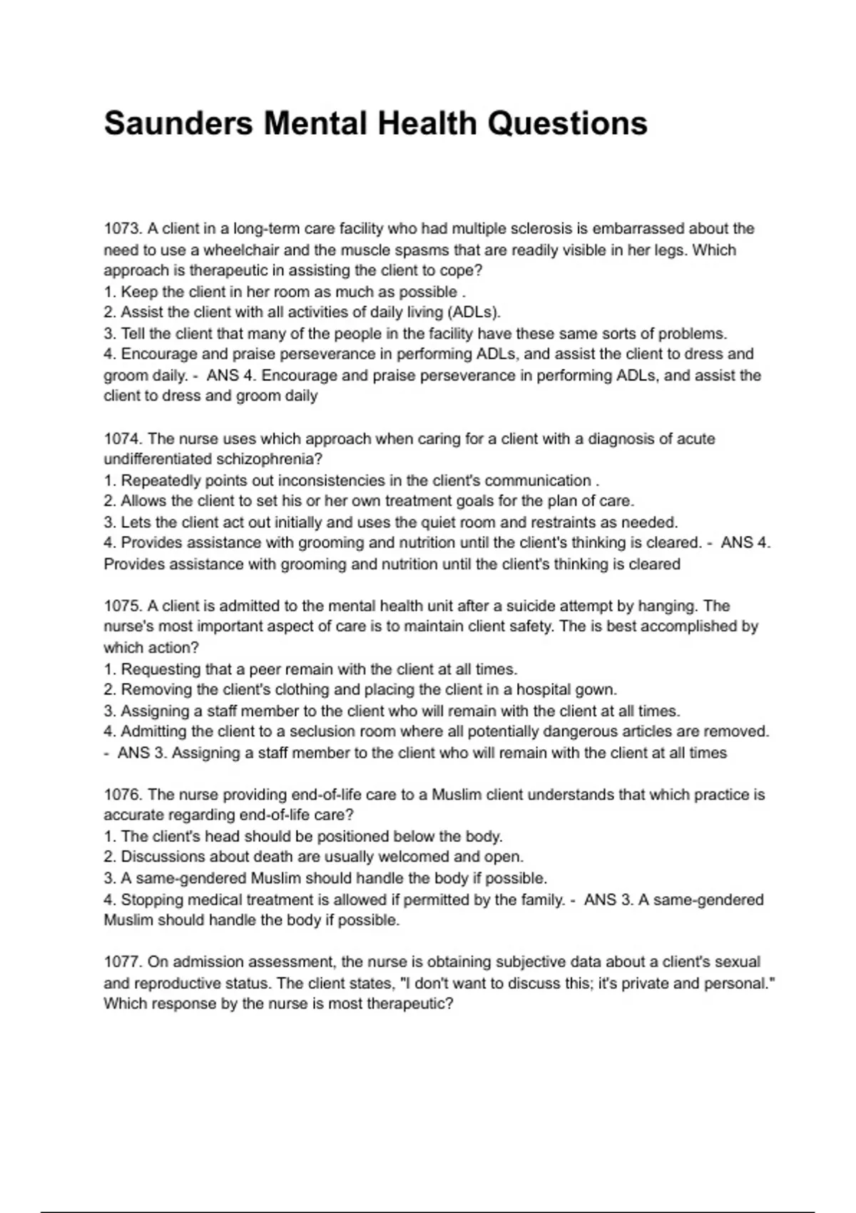 Test Bank -Saunders Mental health Exam Questions and Answers |Complete Guide (A+ RATED) Guaranteed Pass