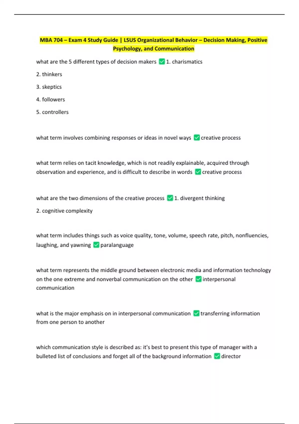 MBA 704 – Kungu – Exam 5 | LSUS MBA Organizational Behavior – Power, Politics, Negotiation, and Stress – Q&A Format 12 Exam (elaborations) MBA 704 – Exam 1 – Theories, Frameworks, Ethics, Diversity & Research Design | LSUS MBA – Key Concepts and Definitions 13 Exam (elaborations) MBA 704 – Kungu – Chapters 1 & 2 | Diversity, Work-Family Programs, a