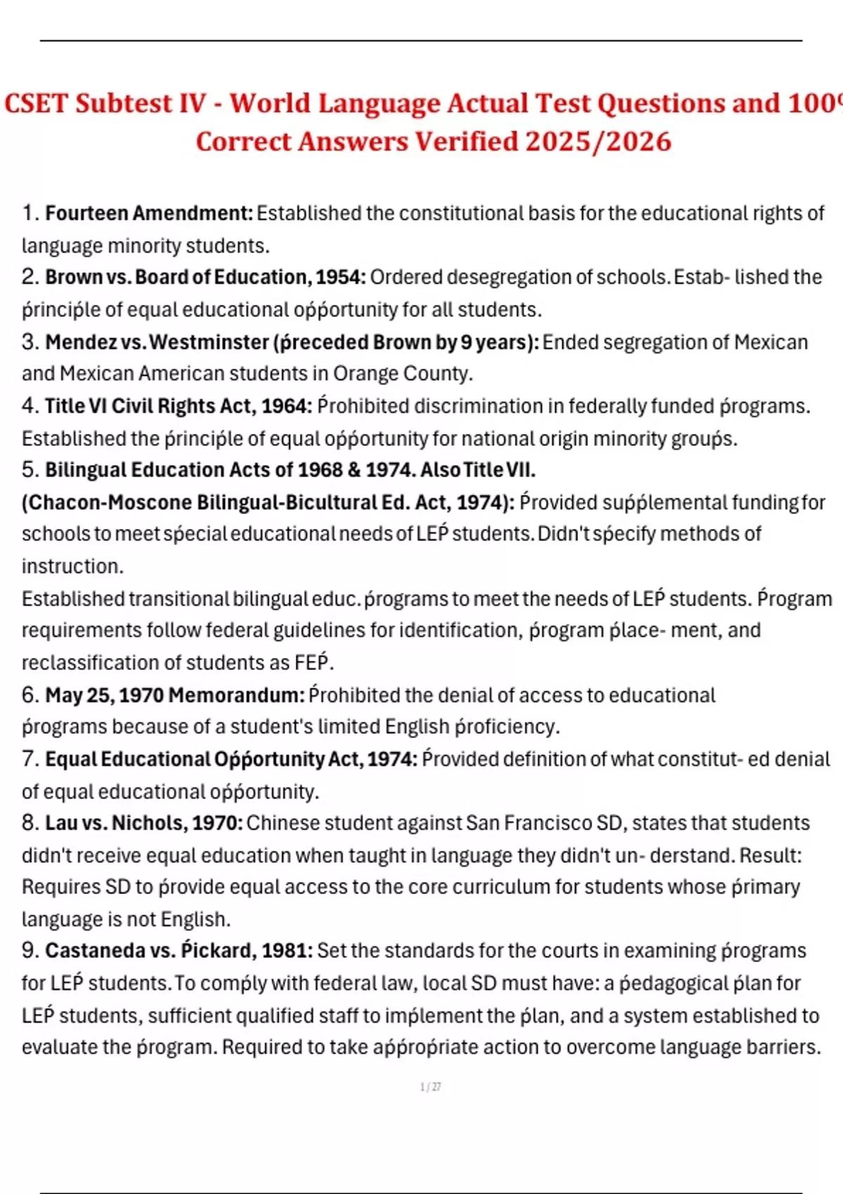 CSET Spanish Subtest I – Study Guide with Verified Questions and Answers (2025/2026) – Graded A CSET Math Subtest I – Test Exam Questions and 100% Verified Answers | Updated 2025/2026 Edition CSET Multiple Subjects: Subtest I – Practice Exam Questions and Answers | 2025/2026 Edition | 100% Guaranteed Pass Support CSET Multiple Subjects – History a