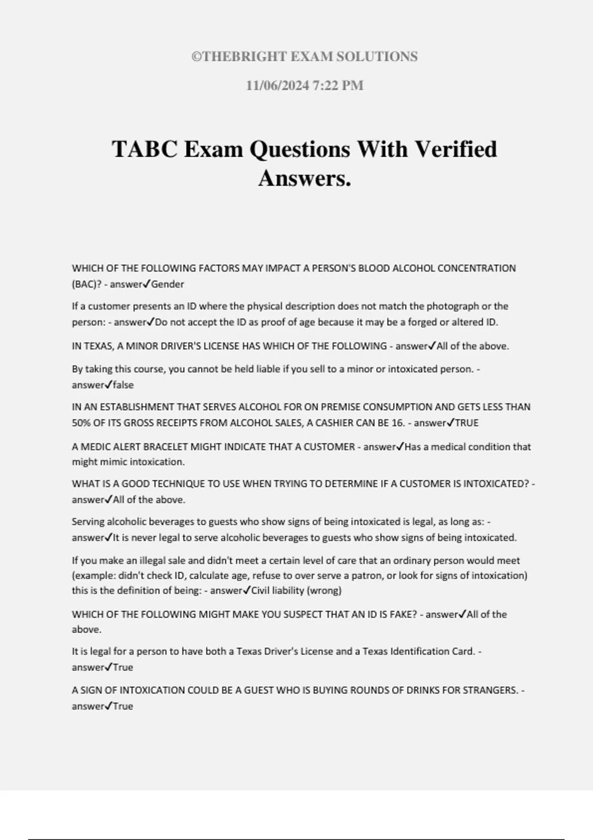 TABC Exam Questions With Verified Answers.