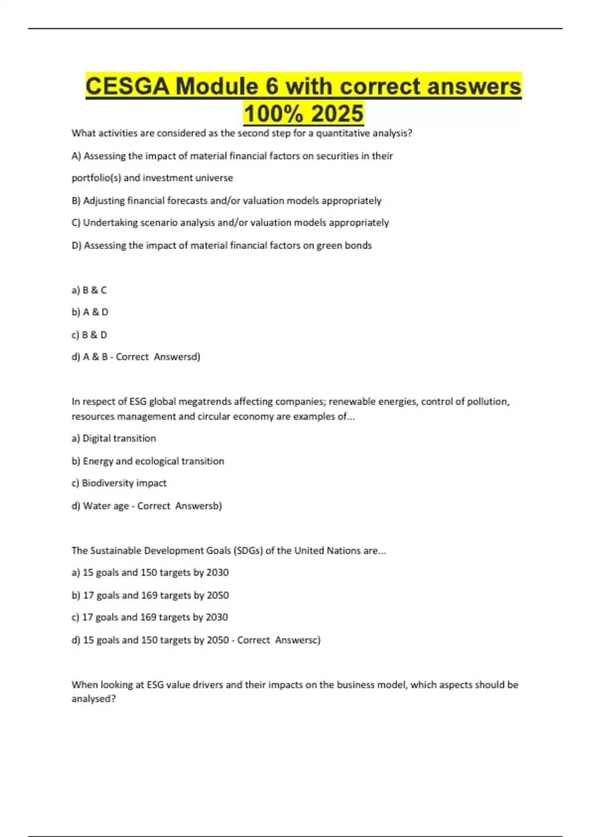 CESGA Module 6 with correct answers 100% 2025 What activities are considered as the second step for a quantitative analysis? A) Assessing the impact of material financial factors on securities in their portfolio(s) and investment universe B) Adjusting financial forecasts and/or valuation models appropriately C) Undertaking scenario analysis and/or