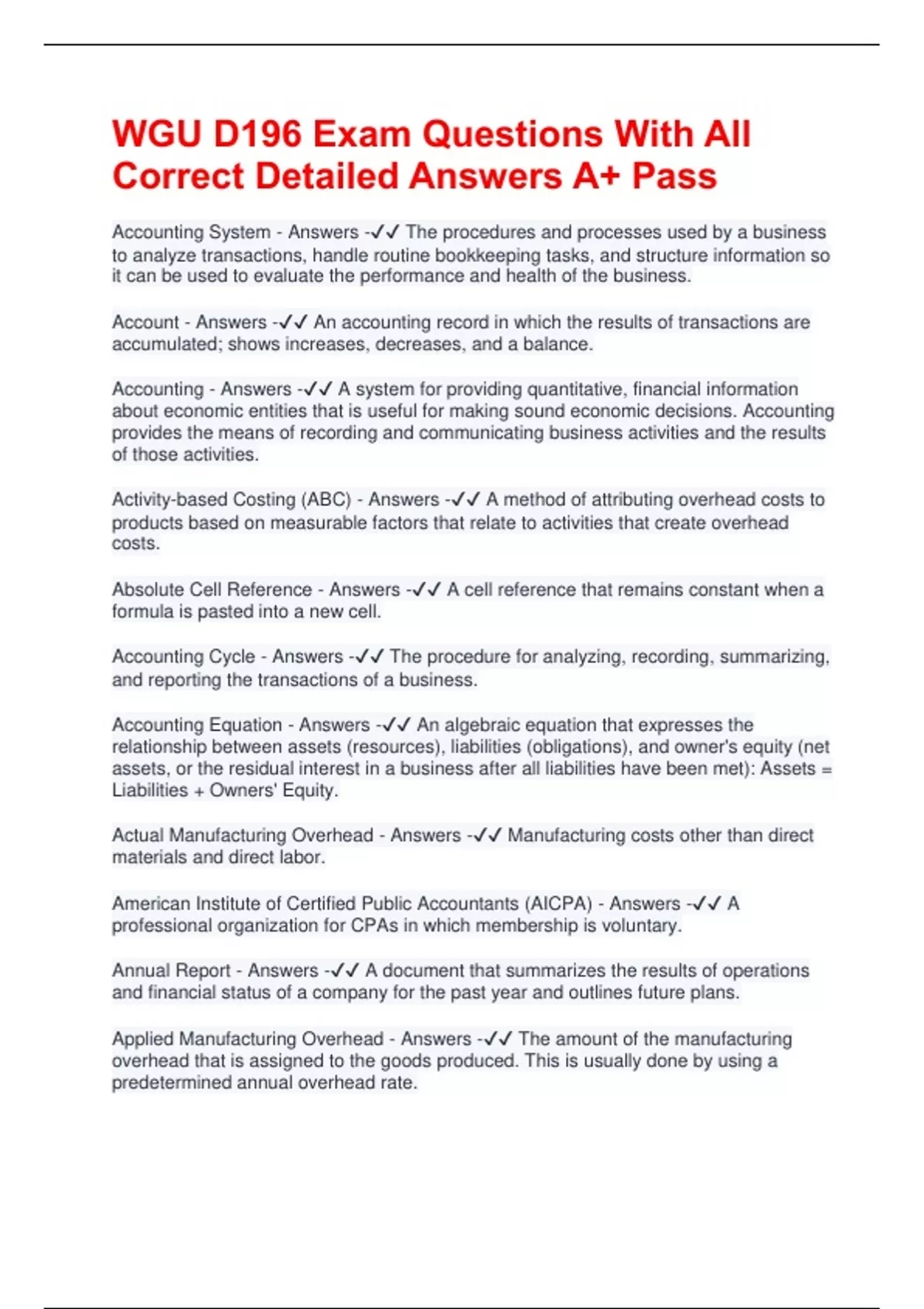 1 Exam (elaborations) WGU D196 Exam (verified 2025) A+ Pass 2 Exam (elaborations) WGU D196 Exam Graded A+ 3 Exam (elaborations) WGU D196 Exam Questions 100% Solved Correctly A+ Pass 4 Exam (elaborations) WGU D196 Exam Questions With 100% Solved Correct Answers A+ Pass