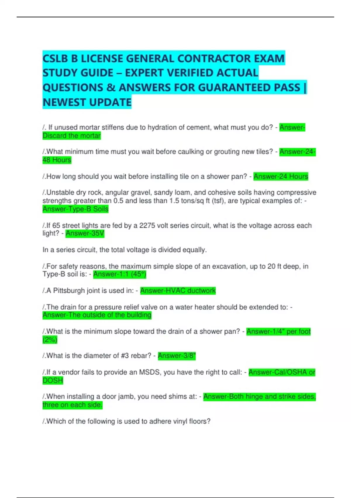 1 Exam (elaborations) CSLB B LICENSE GENERAL CONTRACTOR EXAM STUDY GUIDE – EXPERT VERIFIED ACTUAL QUESTIONS & ANSWERS FOR GUARANTEED PASS | NEWEST UPDATE 2 Exam (elaborations) CSLB CONTRACTOR S LAW & BUSINESS EXAM QUESTIONS WITH NEW UPDATE SOLUTIONS 3 Exam (elaborations) CSLB Contractor s Law practice test Part 2 (Questions and Answers) 2024 / 20