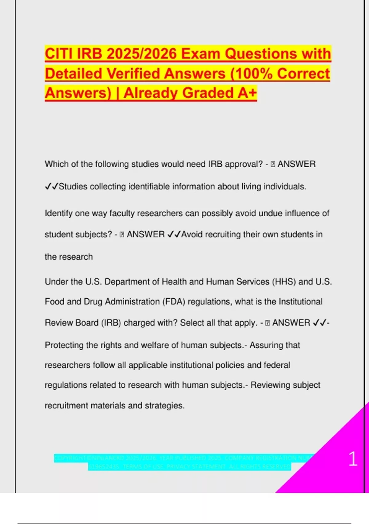 IRB CITI TRAINING EXAM PACKAGE DEAL QUESTIONS AND VERIFIED DETAILED ANSWERS | 100% GUARANTEED PASS | ALREADY GRADED A+