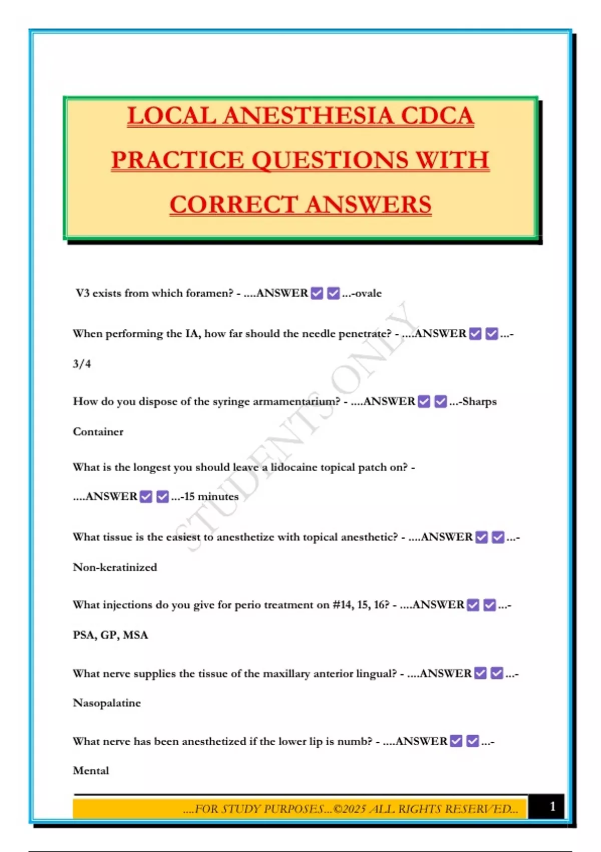 LOCAL ANESTHESIA CDCA PRACTICE QUESTIONS WITH CORRECT ANSWERS