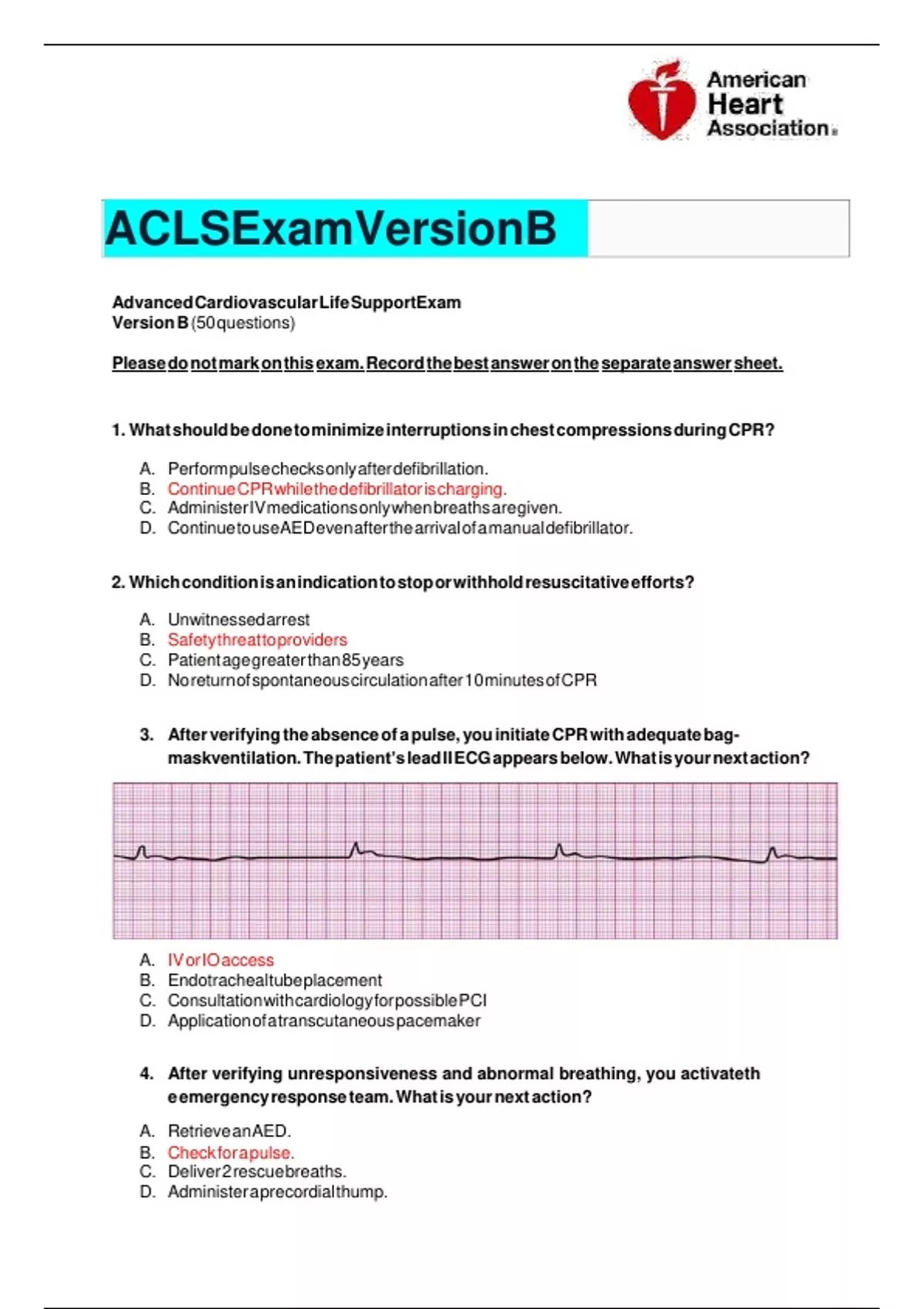 Exam (elaborations) ACLS Exam Version A(Latest Version ) 50 Questions and Answers// Guaranteed A+ 2 Exam (elaborations) ACLS Exam Version A(Latest Version ) 50 Questions and Answers// Guaranteed A+ 3 Exam (elaborations) ACLS Exam Version B /Latest (50 Questions and Answers) GRADED A LAT...