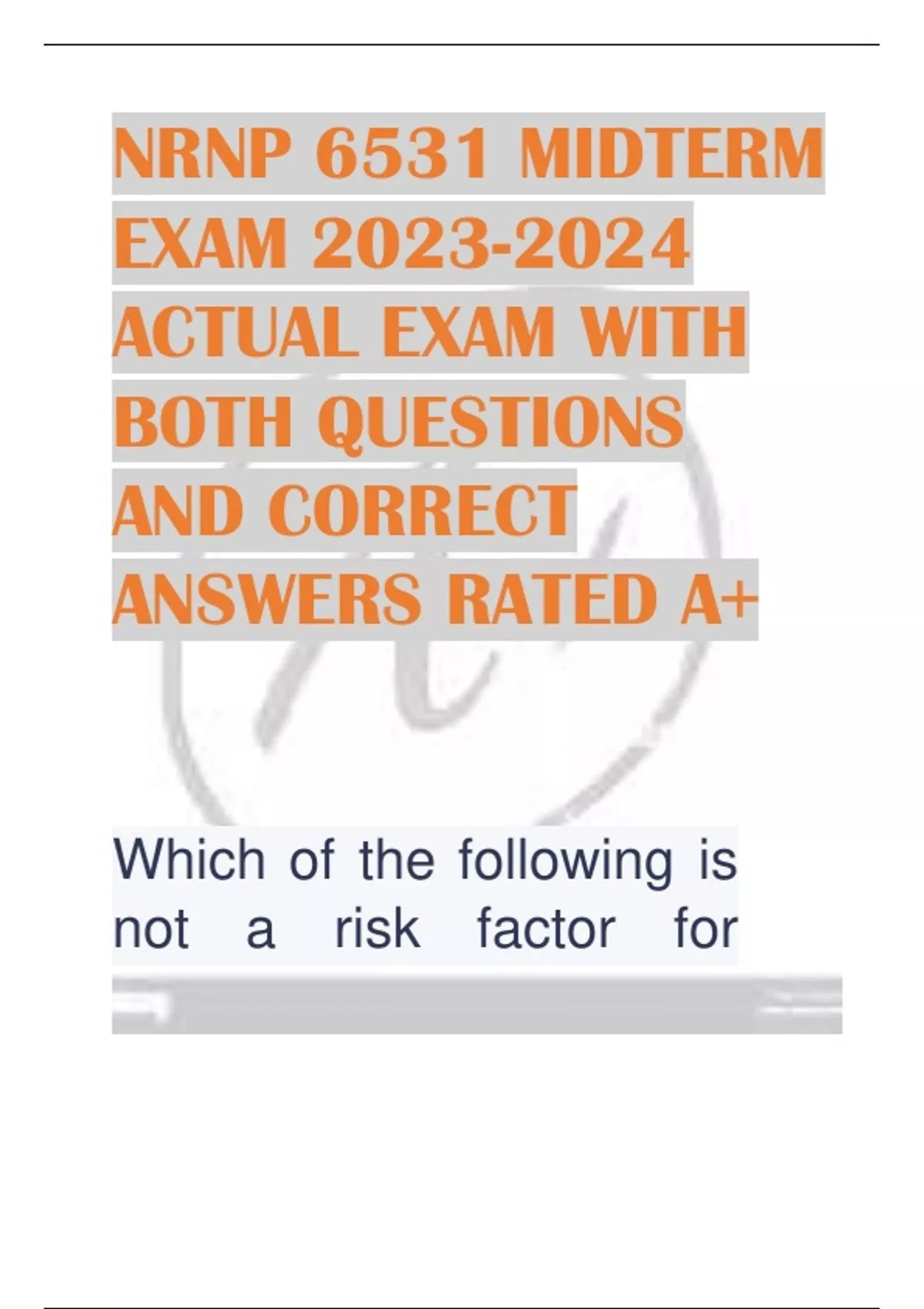 1 Exam (elaborations) NRNP 6531 Exam Combined Midterm and Final Review Over 300+ Questions and Correct Answers Rated A+ 2 Exam (elaborations) NEW NRNP 6531 MIDTERM EXAM ACTUAL EXAM WITH QUESTIONS AND ANSWERS ALREADY RATED 100% GRADED A+ 3 Exam (elaborations) NRNP 6531 Midterm Exam | Actual Exam Questions and Correct