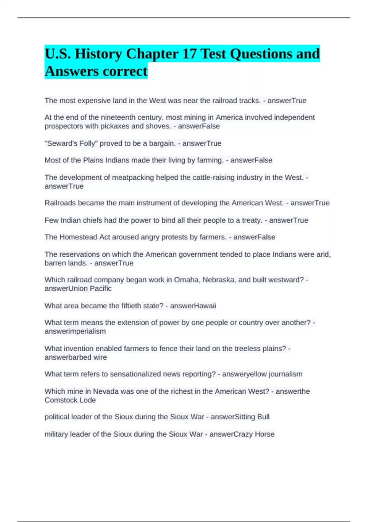 US History Test Questions Final Exam Questions & Answers correct