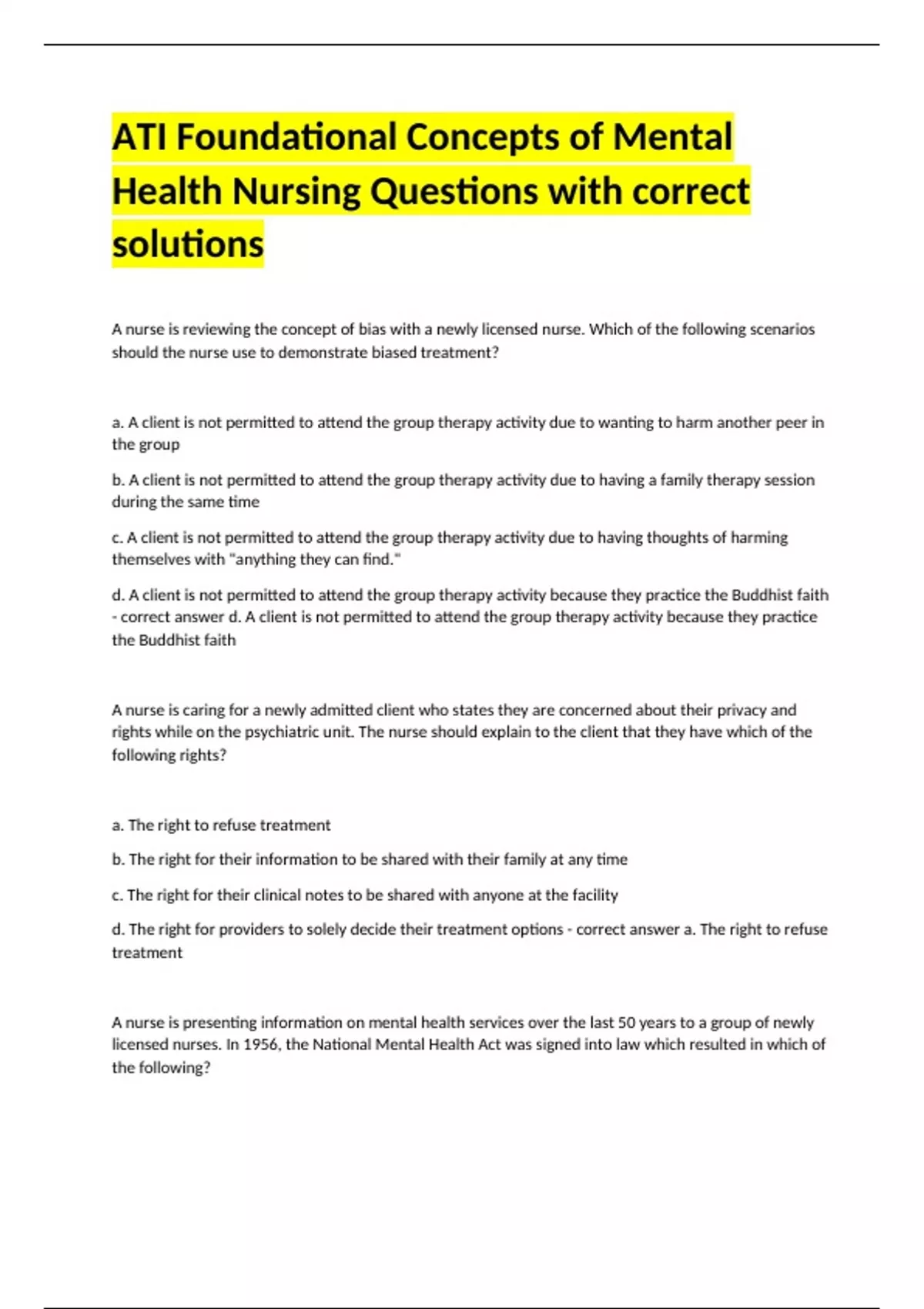 ATI Foundational Concepts of Mental Health Nursing Questions with correct solutions