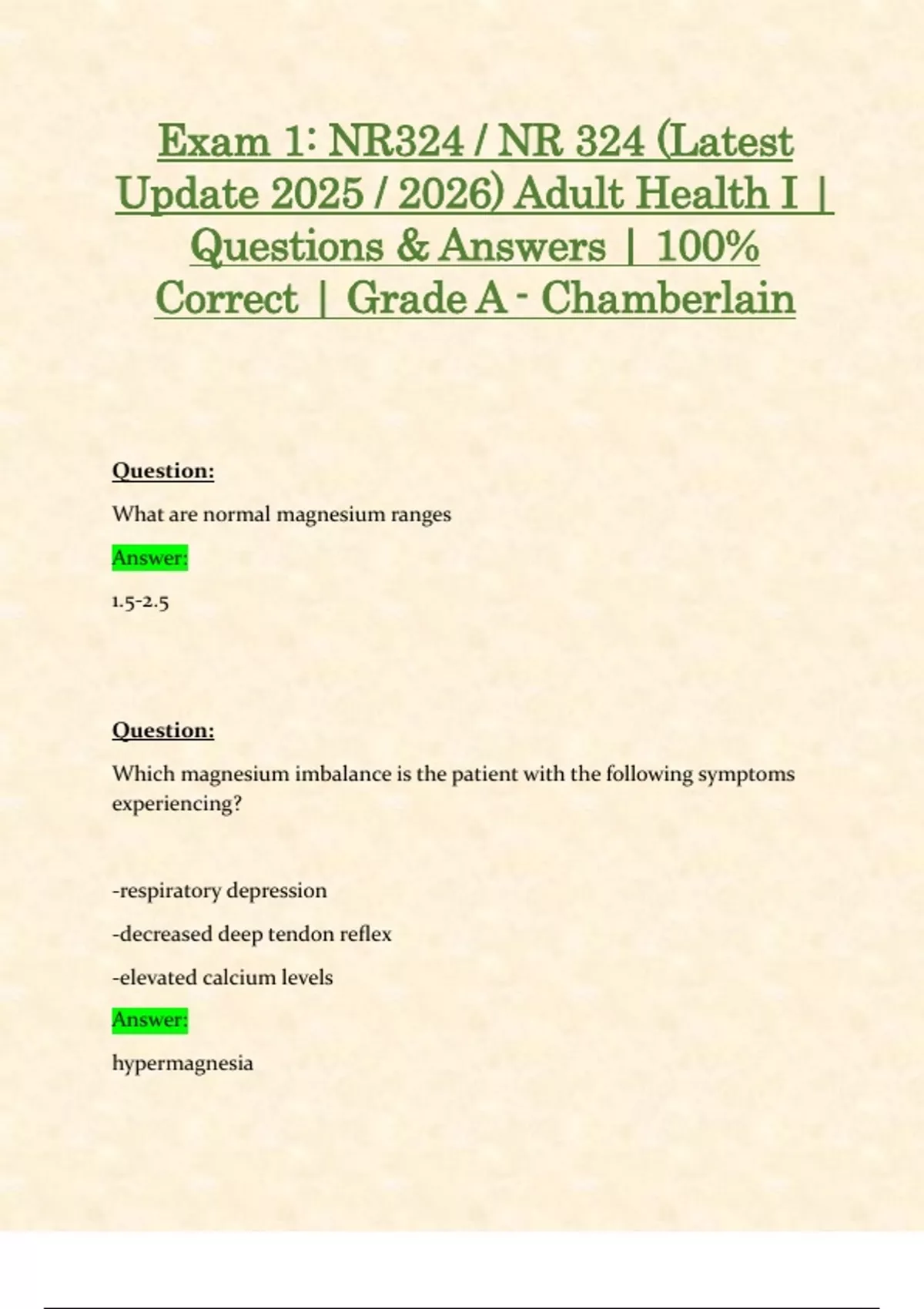 Exam 1, Exam 2 & Final Exam: NR324 / NR324 (Latest 2025 / 2026 Updates STUDY BUNDLE PACKAGE WITH SOLUTIONS) Adult Health I | Questions & Answers | Grade A | 100% Correct (Verified Solutions) - Chamberlain
