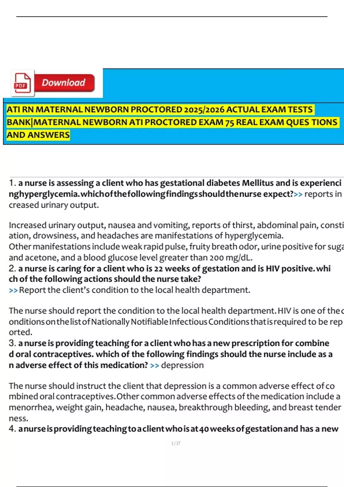 EXAM BUNDLE FOR ATI MATERNAL NEWBORN PREDICTOR EXAM 2025/2026 WITH ACTUAL CORRECT QUESTIONS AND VERIFIED DETAILED ANSWERS