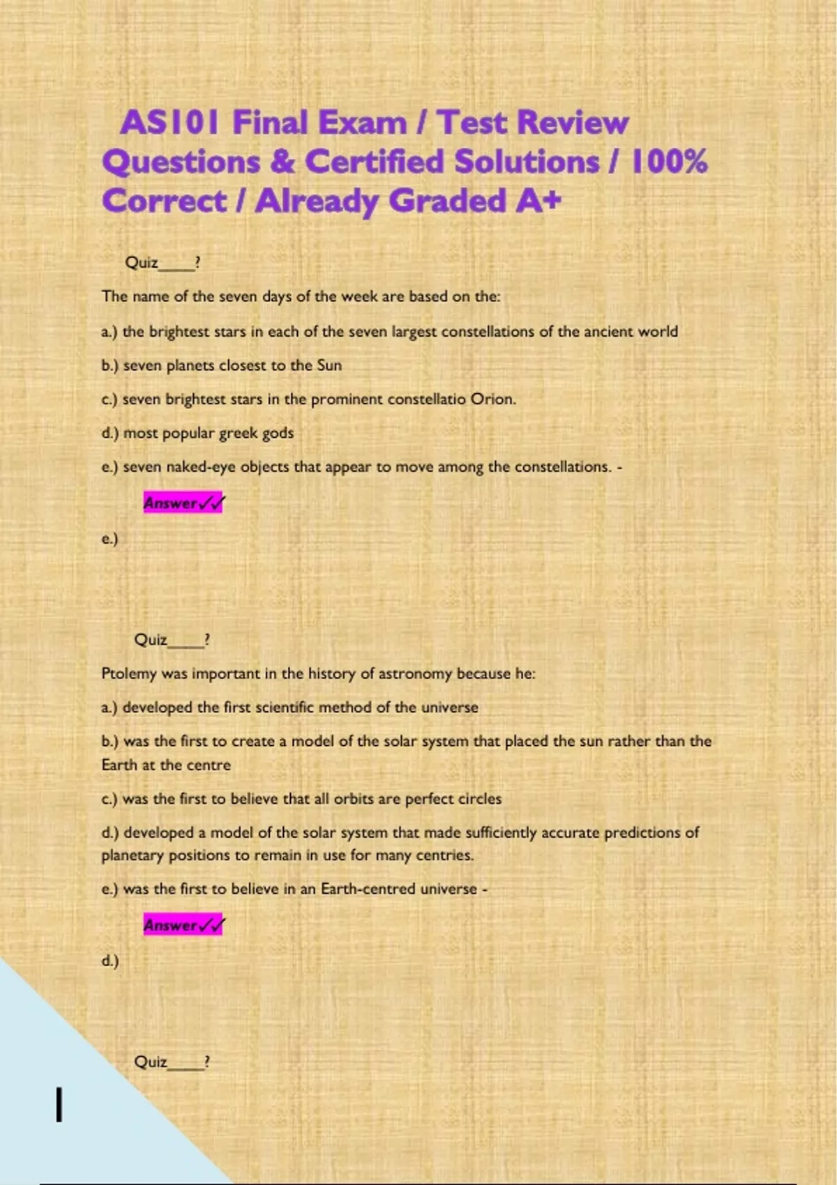 1 Exam (elaborations) AS101 Final Exam / Test Review Questions & Certified Solutions / 100% Correct / Already Graded A 2 Exam (elaborations) AS101 Midterm 1 / Q-Bank/ Complete Accurate Quizzes with Verified Answers, 2025 / 2026. 3 Exam (elaborations) AS 101 Final Exam / Newest Actual Exam Review Q&A with Definitive Answers / A Score Solutions.