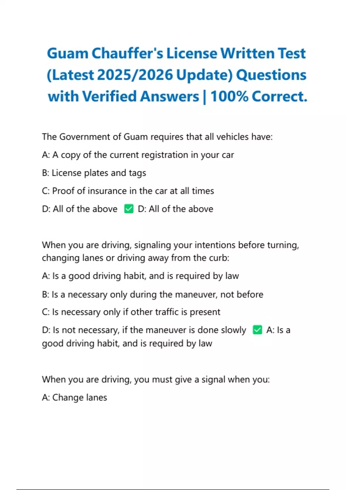 Guam Chauffer's License Exams PACKAGE DEAL| BUNDLE contains the Latest written test, practice quiz, Exam-prep, Test Bank and updated study guide - Everything you need to pass is here!!