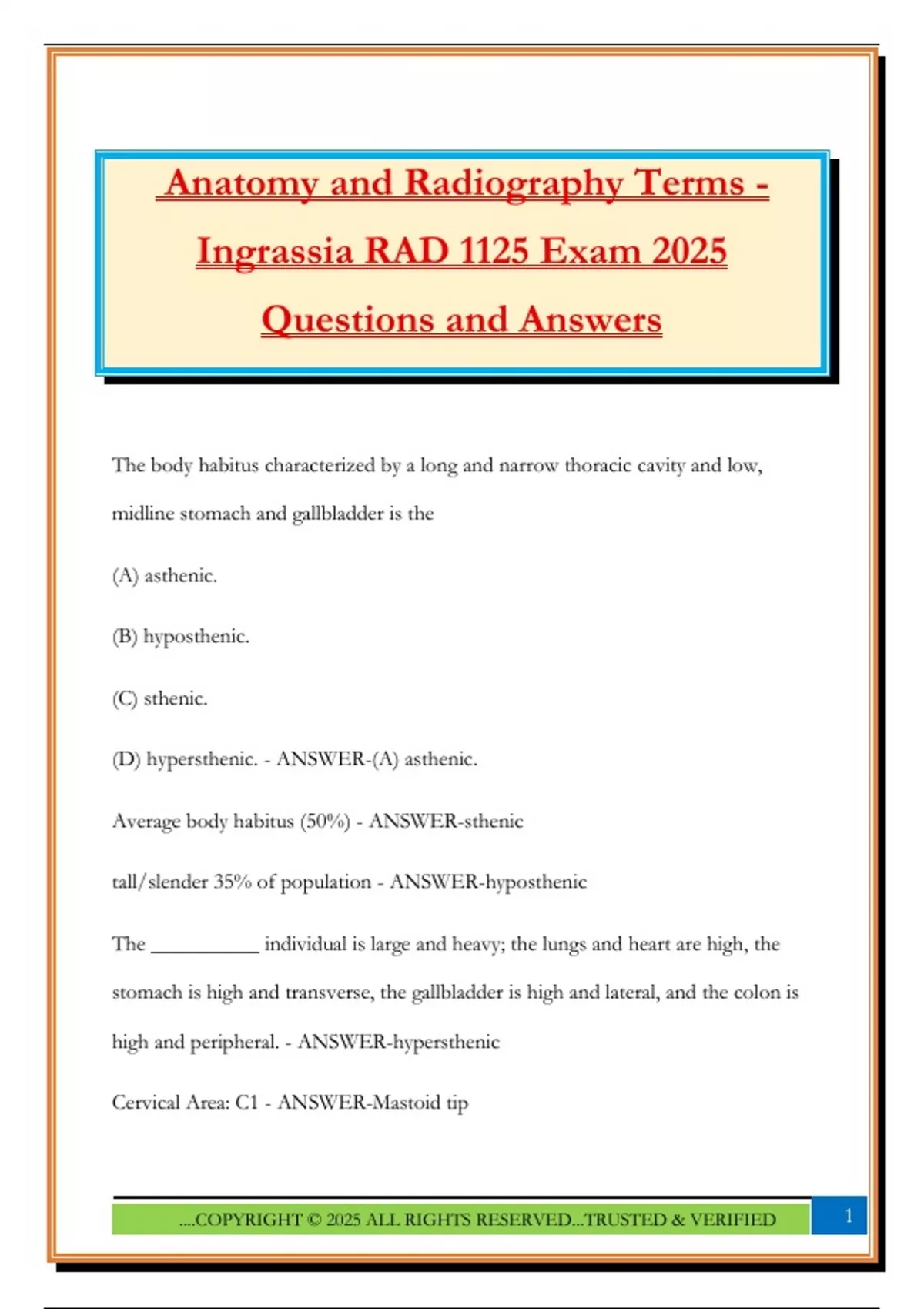 Anatomy and Radiography Terms - Ingrassia RAD 1125 Exam 2025 Questions and Answers
