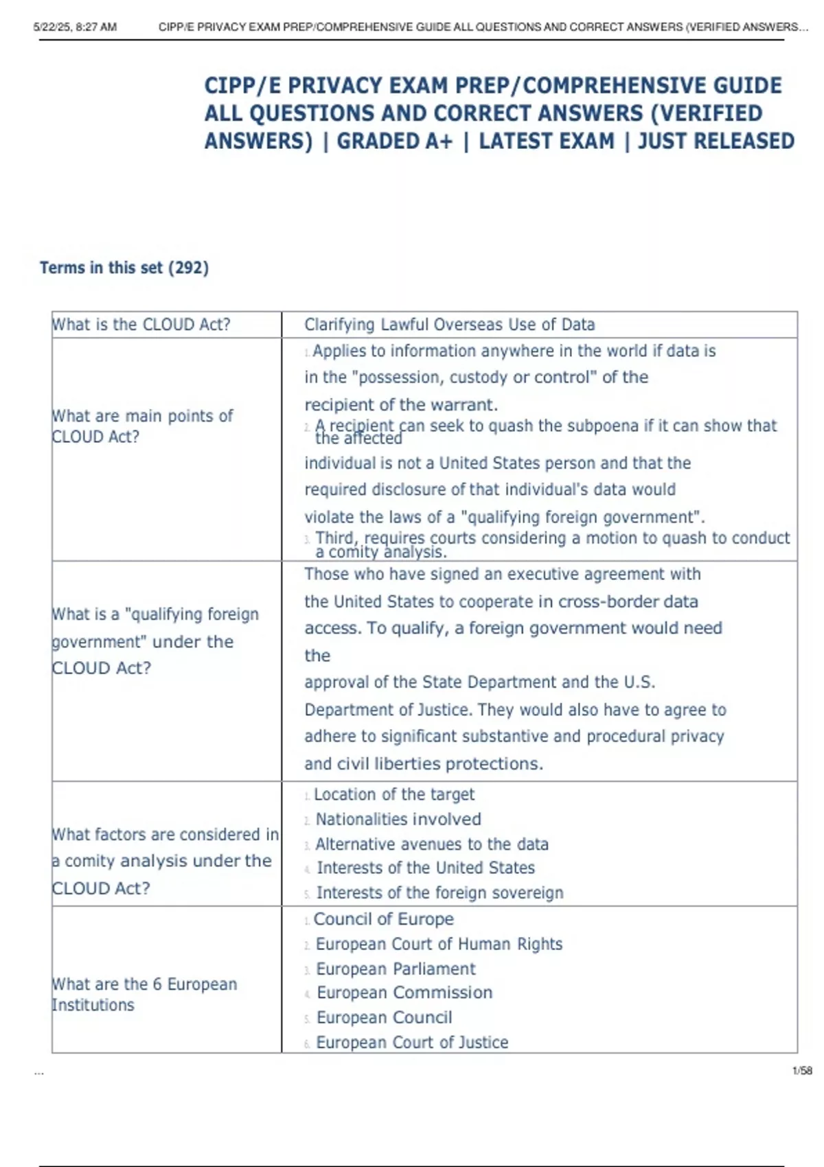 CIPP/E PRIVACY EXAM PREP/COMPREHENSIVE GUIDE ALL QUESTIONS AND CORRECT ANSWERS (VERIFIED ANSWERS) | GRADED A+ | LATEST EXAM | JUST RELEASED CIPP/E PRIVACY EXAM PREP/COMPREHENSIVE GUIDE ALL QUESTIONS AND CORRECT ANSWERS (VERIFIED ANSWERS) | GRADED A+ | LATEST EXAM | JUST RELEASED