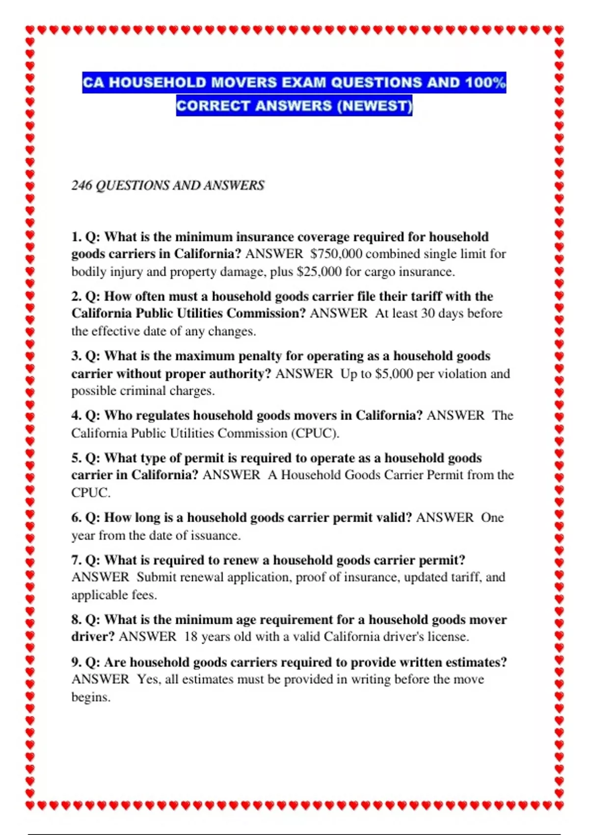 CA HOUSEHOLD MOVERS PACKAGED EXAMS