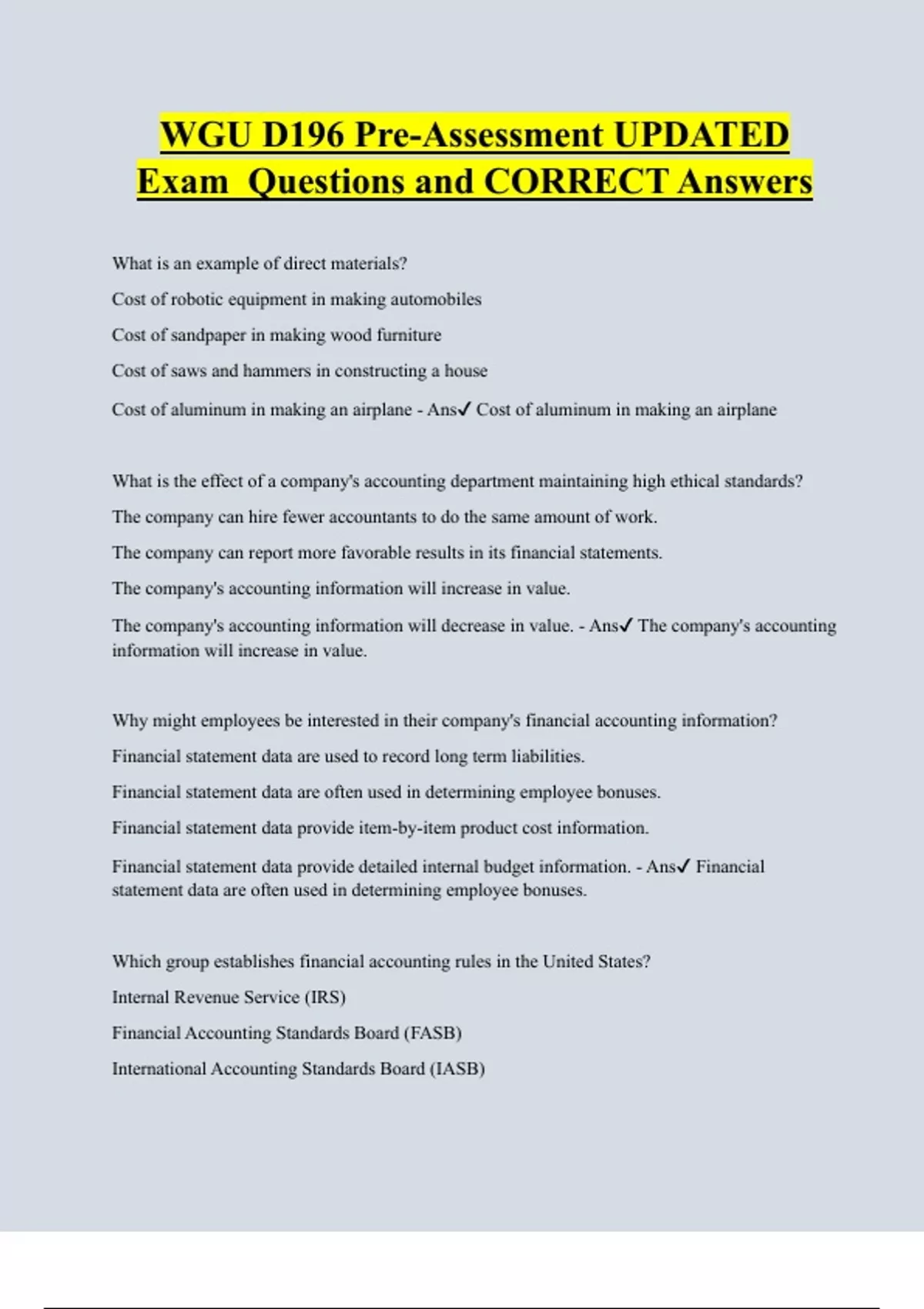 D196 Principles of Financial and Managerial Accounting UPDATED ACTUAL Exam Questions and CORRECT Answers