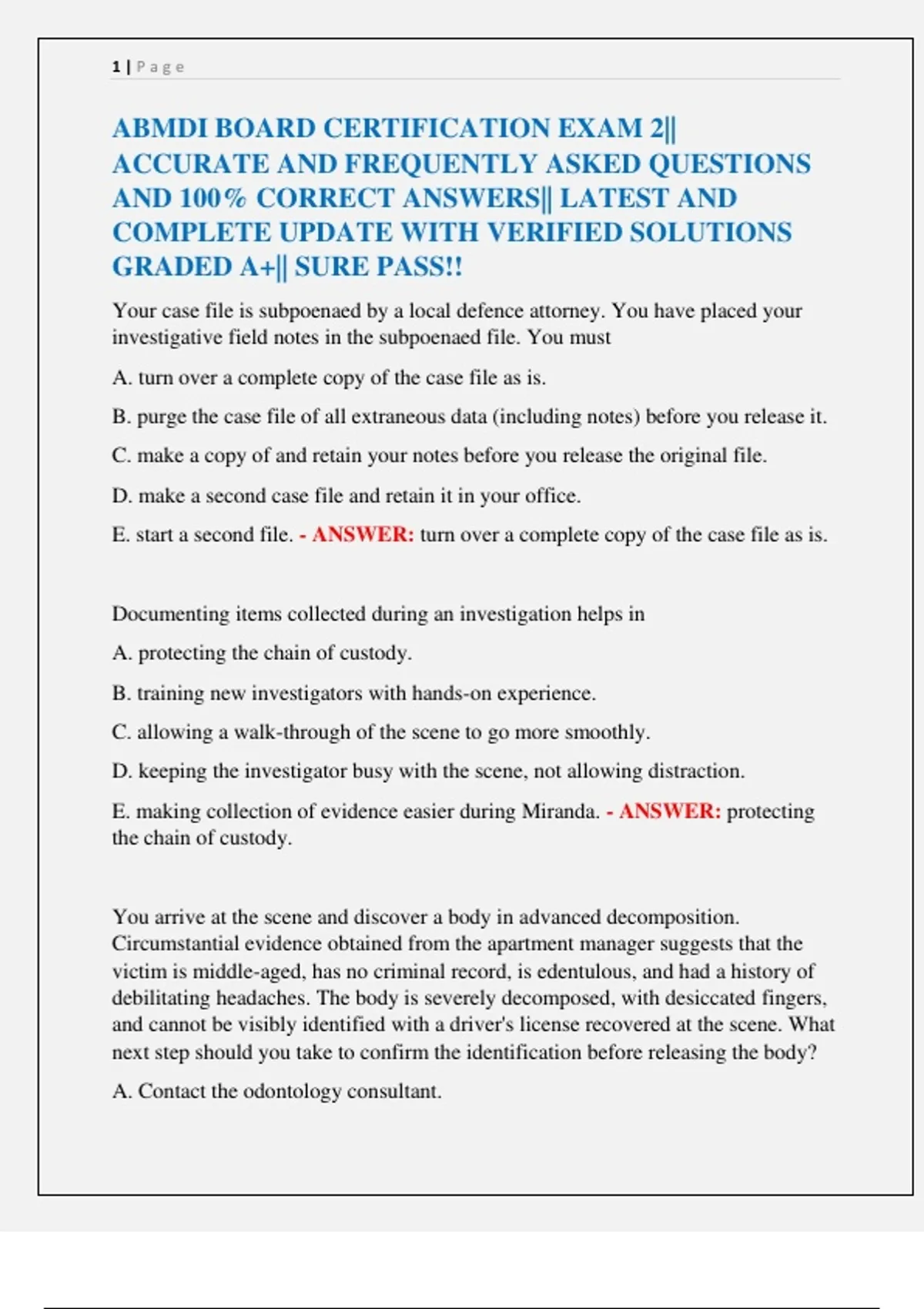 ABMDI BOARD CERTIFICATION EXAMS PACKAGE|| ACCURATE AND FREQUENTLY ASKED QUESTIONS AND 100% CORRECT ANSWERS|| LATEST AND COMPLETE UPDATE WITH VERIFIED SOLUTIONS GRADED A+|| SURE PASS!!