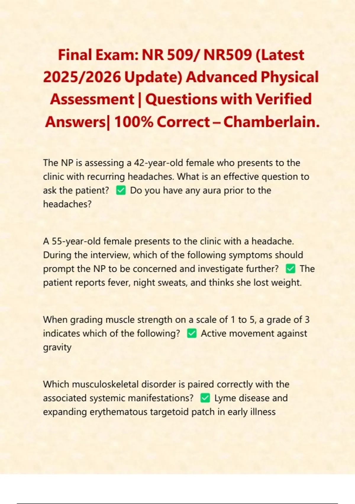 Final Exam : NR 509/ NR509 Advanced Physical Assessment PACKAGE DEAL| BUNDLE contains the Latest final exams and study guide with Verified Answers for Chamberlain College of Nursing- Guaranteed Success.