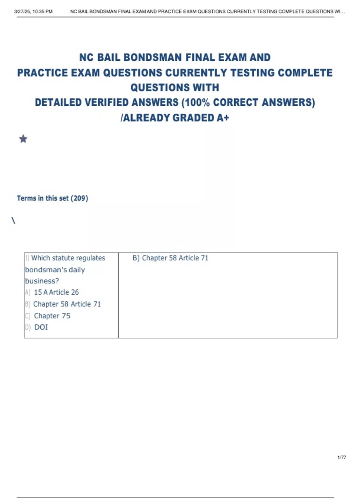 NC BAIL BONDS FINAL EXAM AND PRACTICE EXAM QUESTIONS CURRENTLY TESTING COMPLETE QUESTIONS WITH DETAILED VERIFIED ANSWERS (100% CORRECT ANSWERS) /ALREADY GRADED A+ NC BAIL BONDS FINAL EXAM AND PRACTICE EXAM QUESTIONS CURRENTLY TESTING COMPLETE QUESTIONS WITH DETAILED VERIFIED ANSWERS (100% CORRECT ANSWERS) /ALREADY GRADED A+ NC BAIL BONDS FINAL EXAM