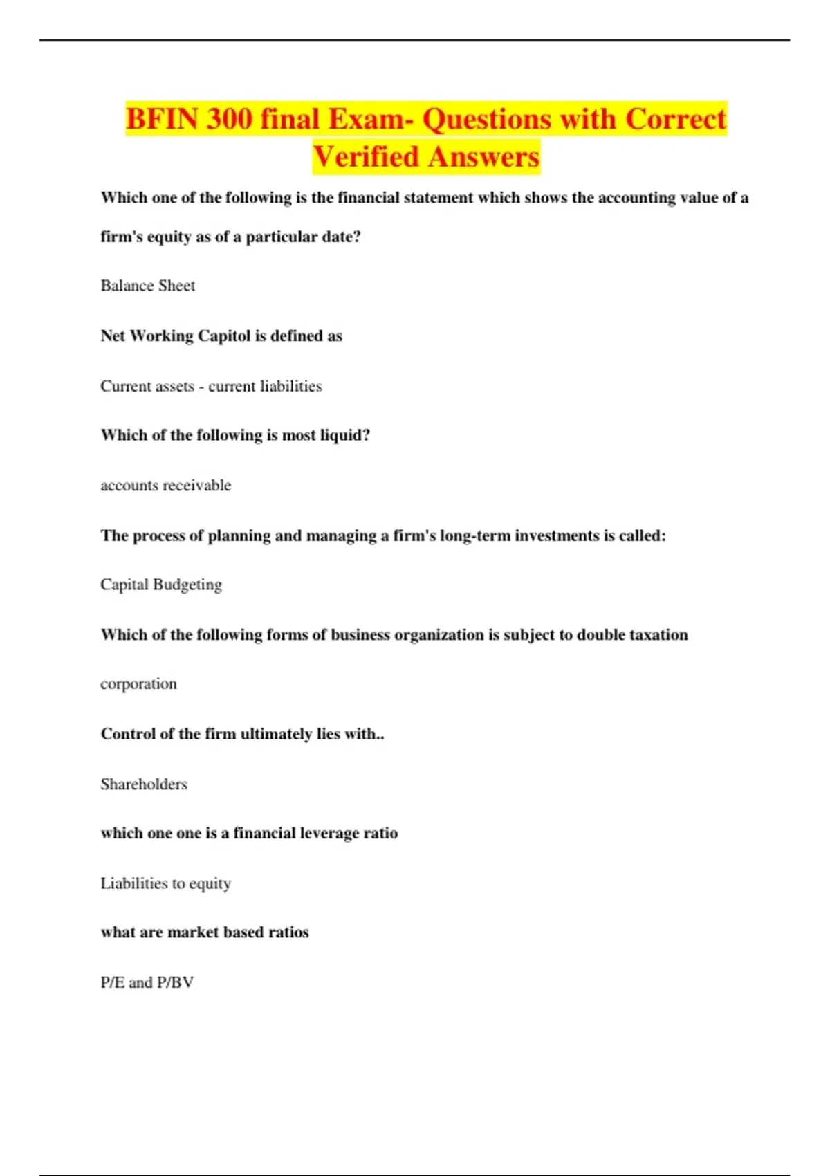 BFIN 300 Final Review Questions with Correct Verified Answers