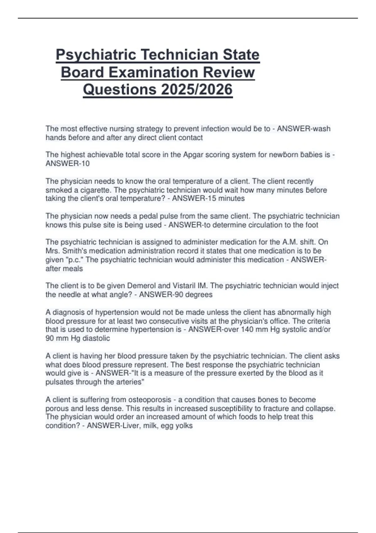 Package deal for Psychiatric Technician Psychiatric Technician State Board Examination Review Questions 2025/2026