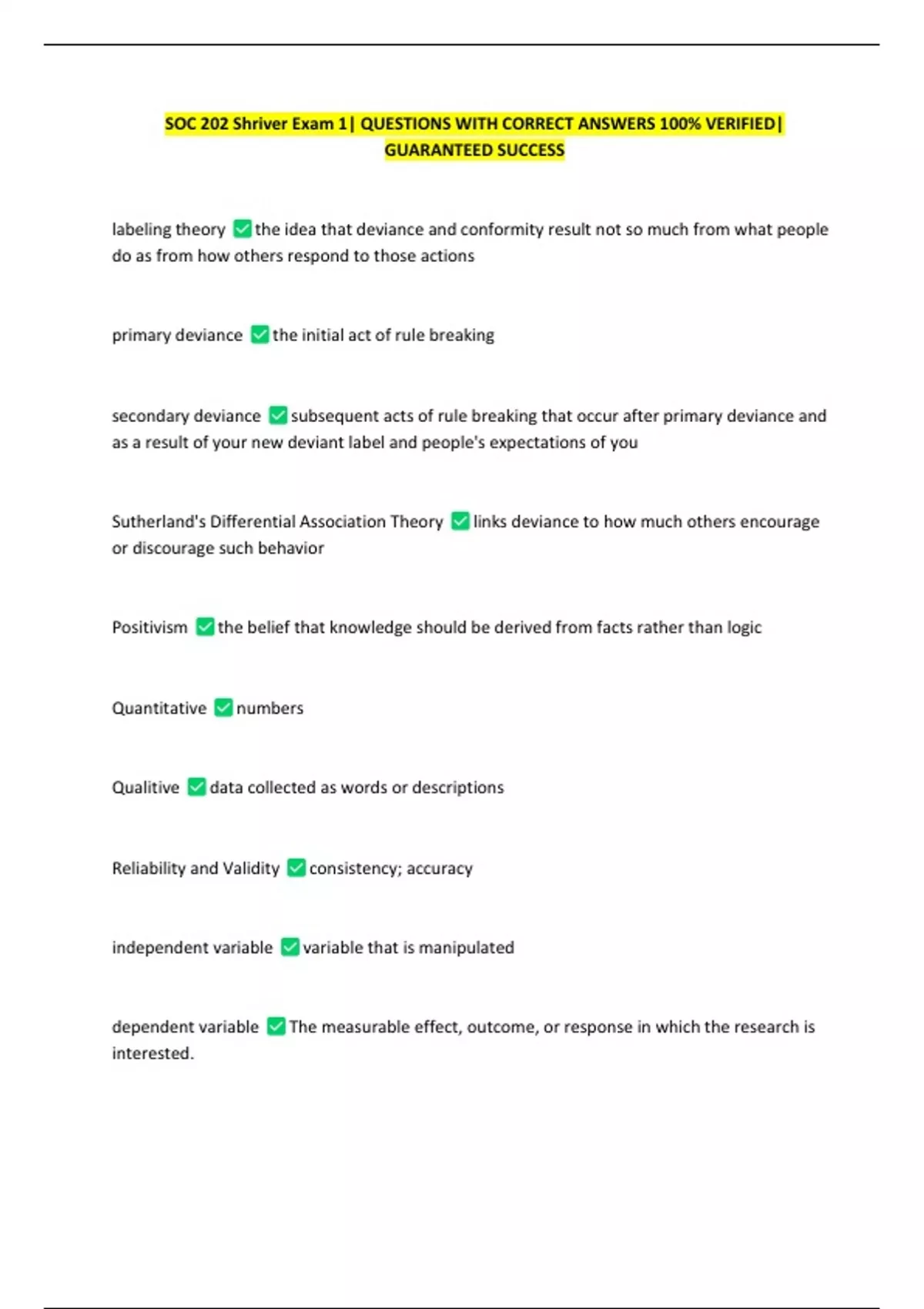 SOC 202 Shriver Exam 1| QUESTIONS WITH CORRECT ANSWERS 100% VERIFIED| GUARANTEED SUCCESS