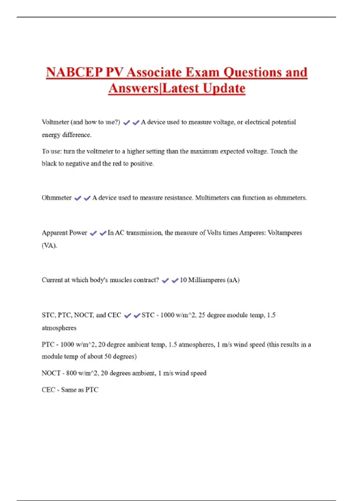 1 Exam (elaborations) NABCEP PV Associate Exam Questions and Answers|Latest Update 2 Exam (elaborations) Nabcep Pv Associate Exam Questions With Complete Solutions 3 Exam (elaborations) NABCEP!!! PV Associates FINAL EXAM Whoo hoo!! 100% Questions and Answers 4 Exam (elaborations) NABCEP Associate Exam Questions and Answers 100% Solved